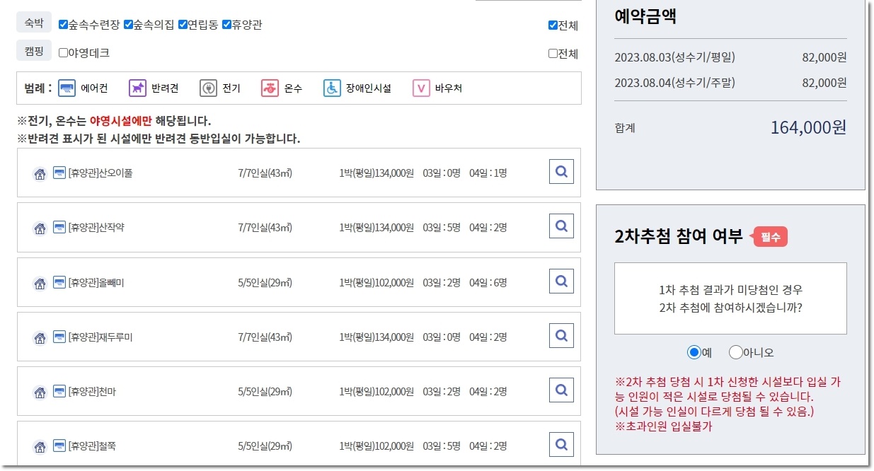 자연휴양림 예약방법은 회원 1인당 객실 또는 야영시설 1회만이 신청가능합니다. 예전에는 숲속의집 등 객실하나와 야영장 하나를 각각 신청할 수있었는데 인기가 높아지면서 이제는 둘중 하나만 선택해야 합니다.