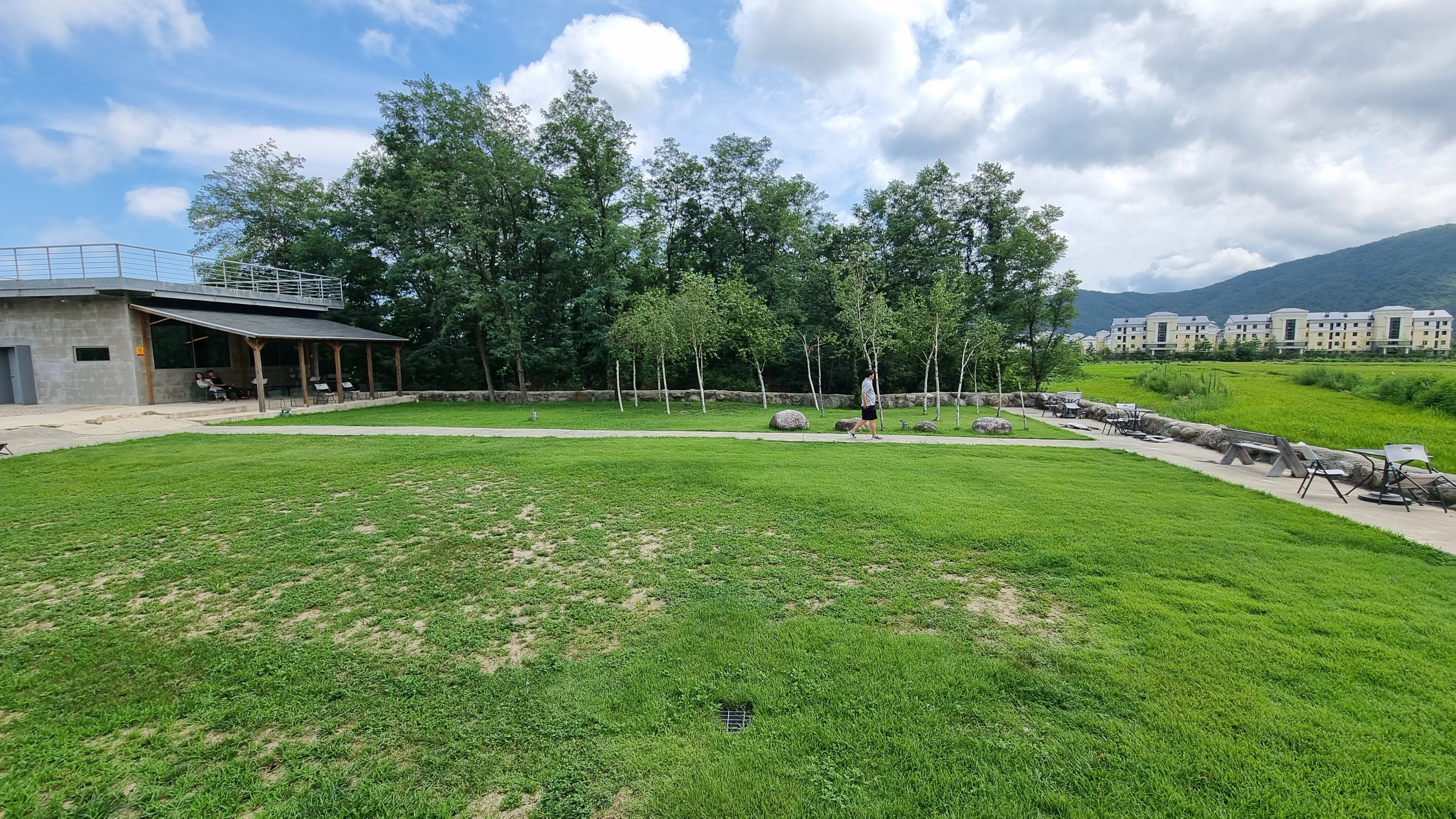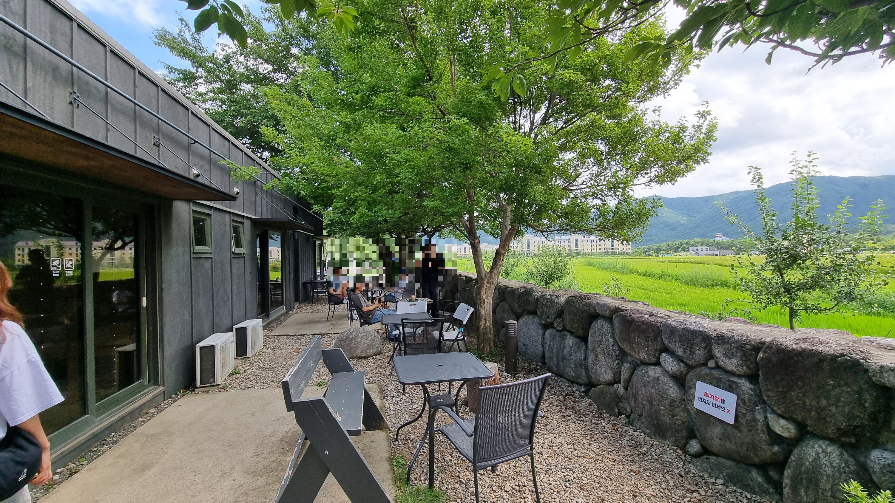 커다란 창 너머로는 끝없이 펼쳐진 논밭이, 그 너머로는 웅장한 설악산 울산바위가 자리해 마치 그림 같은 풍경을 선사합니다. 야외좌석은 한여름에도 큰 나무 아래서 솔솔 부는 바람에 목가적 풍경을 즐길수 있는 속초카페죠.