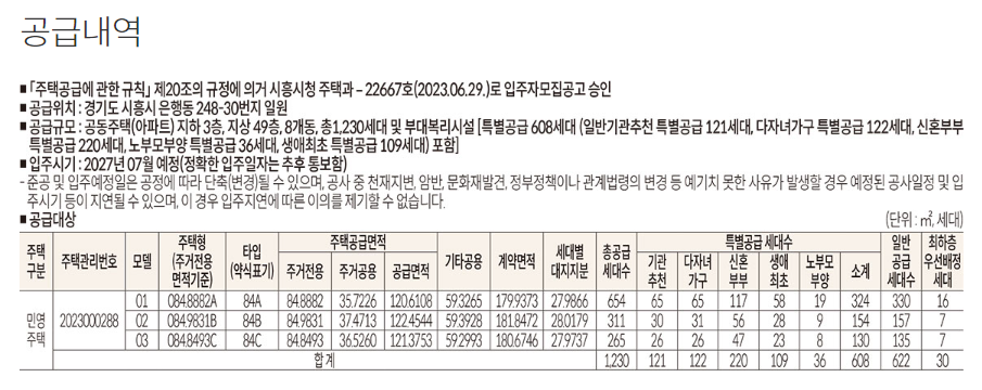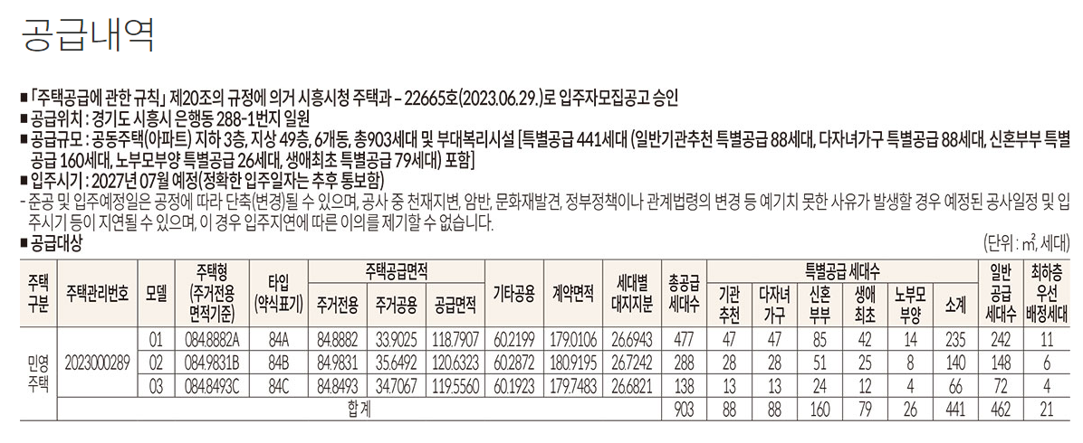 시흥롯데캐슬 2블록은 지하3층, 지산49층으로 총903세대를 공급하며 특별공급물량은 441세대입니다. 당현장또한 84㎡ 단일평형으로 공급됩니다.