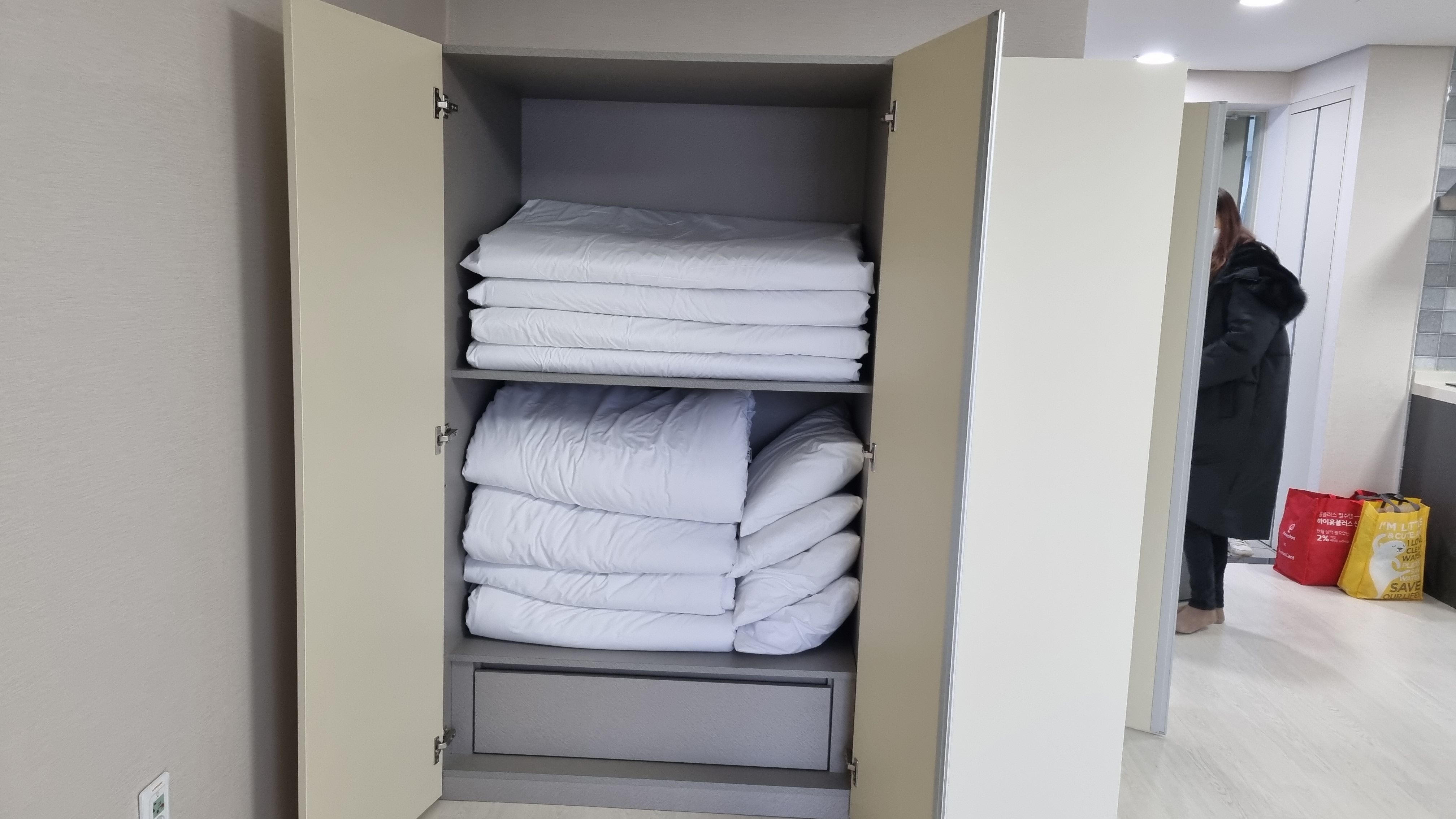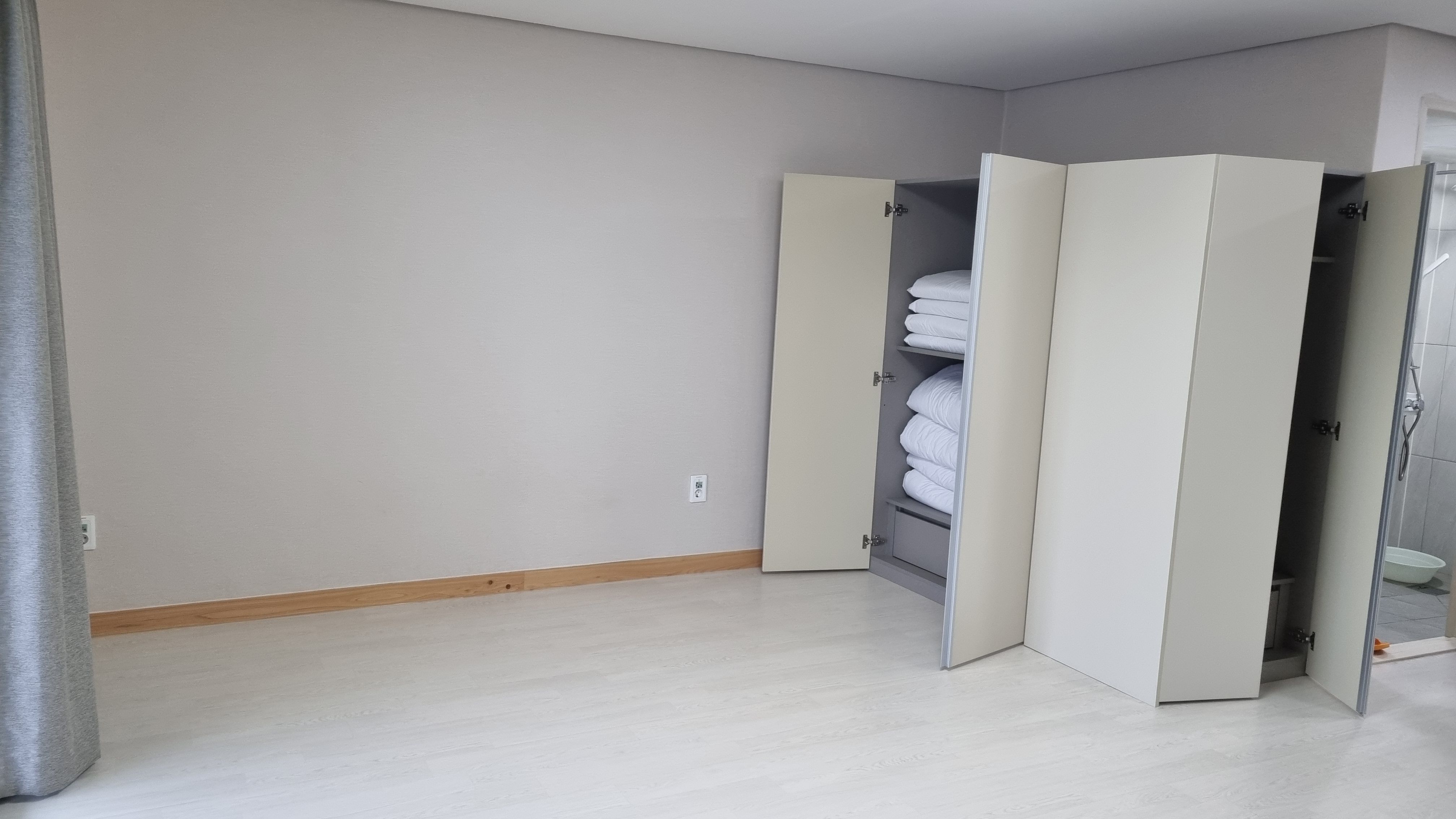 침구 4인기준에 맞게 보송보송한 이불로 준비되어 있는데요, 지난 여름 가봤던 강원도 자연휴양림에서는 솜이 다죽어서 담요를 깔았는지 바닥에서 자는건지 구분이 안되었는데 신시도자연휴양림 상현달 침구는 푹신합니다.