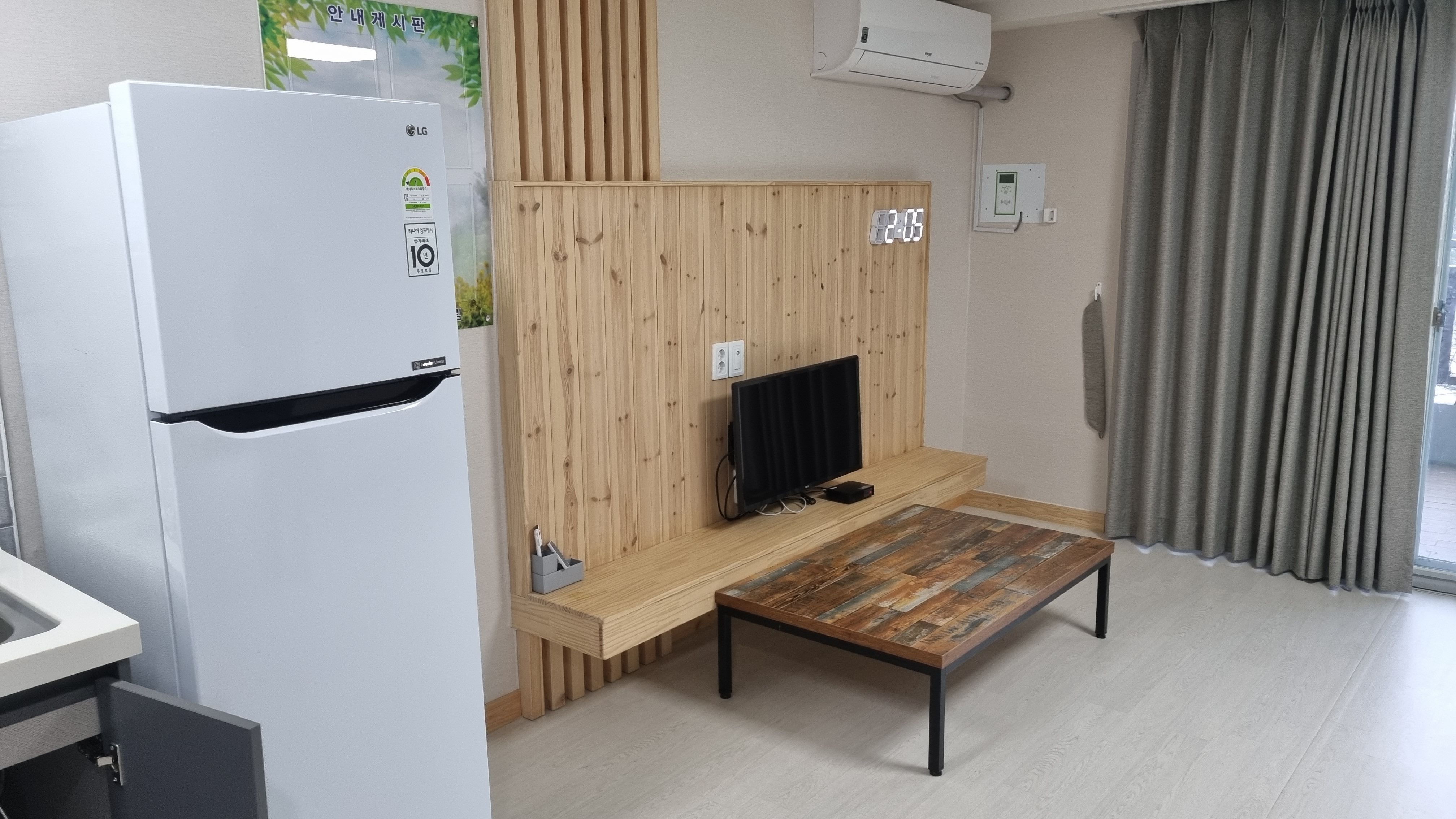 냉장고도 큼직막해서 오는길에 회를 사온다면 보관하기 좋고 여러날 숙박을 해도 냉장고가 넓어서 음식 보관에는 문제가 없겠네요. 상대적으로 티비는 작더라구요.