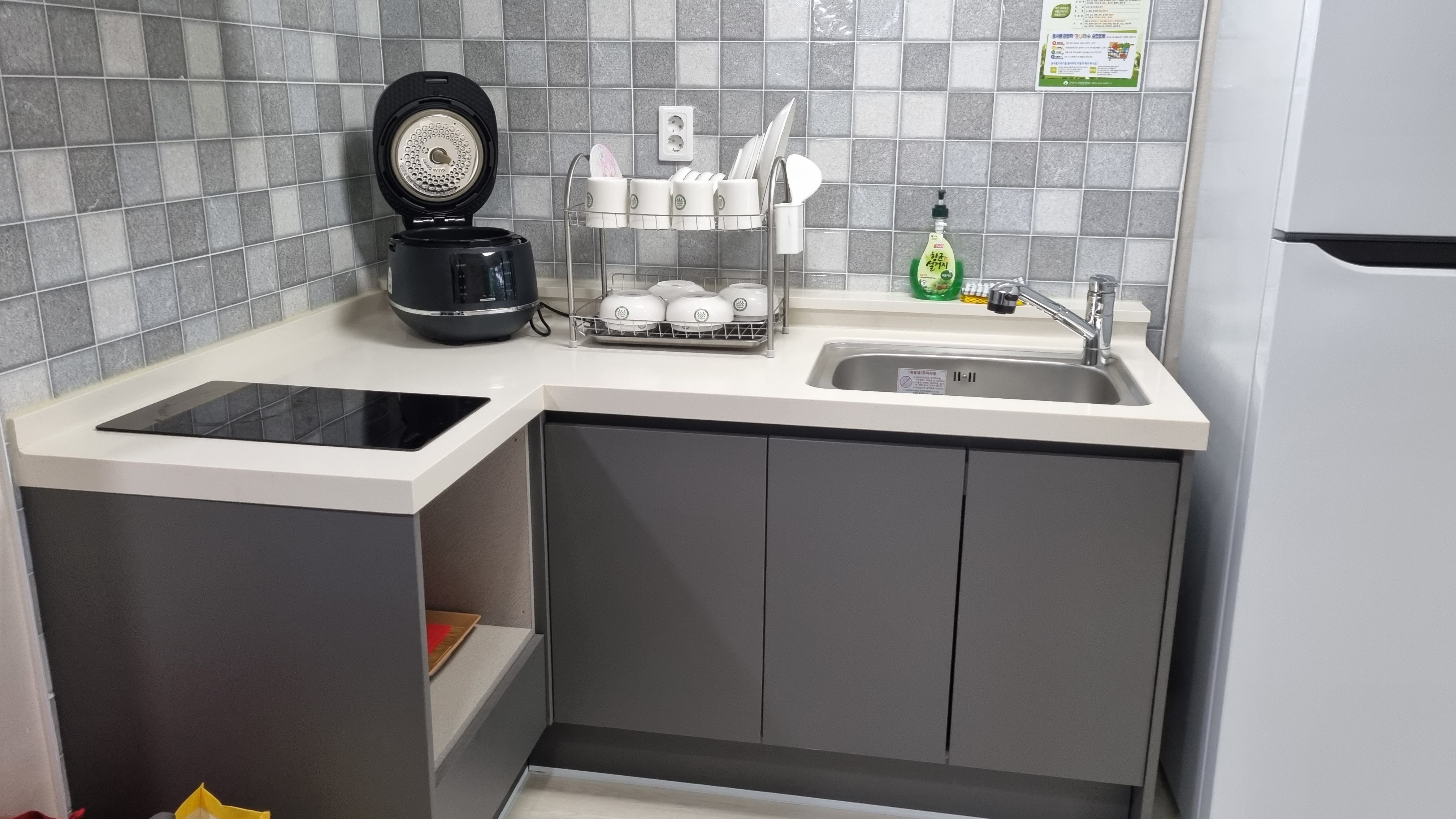 주방에는 압력밥솥, 식기류, 냉장고, 인덕션 등 필요한 모든 것이 갖춰져 있습니다.