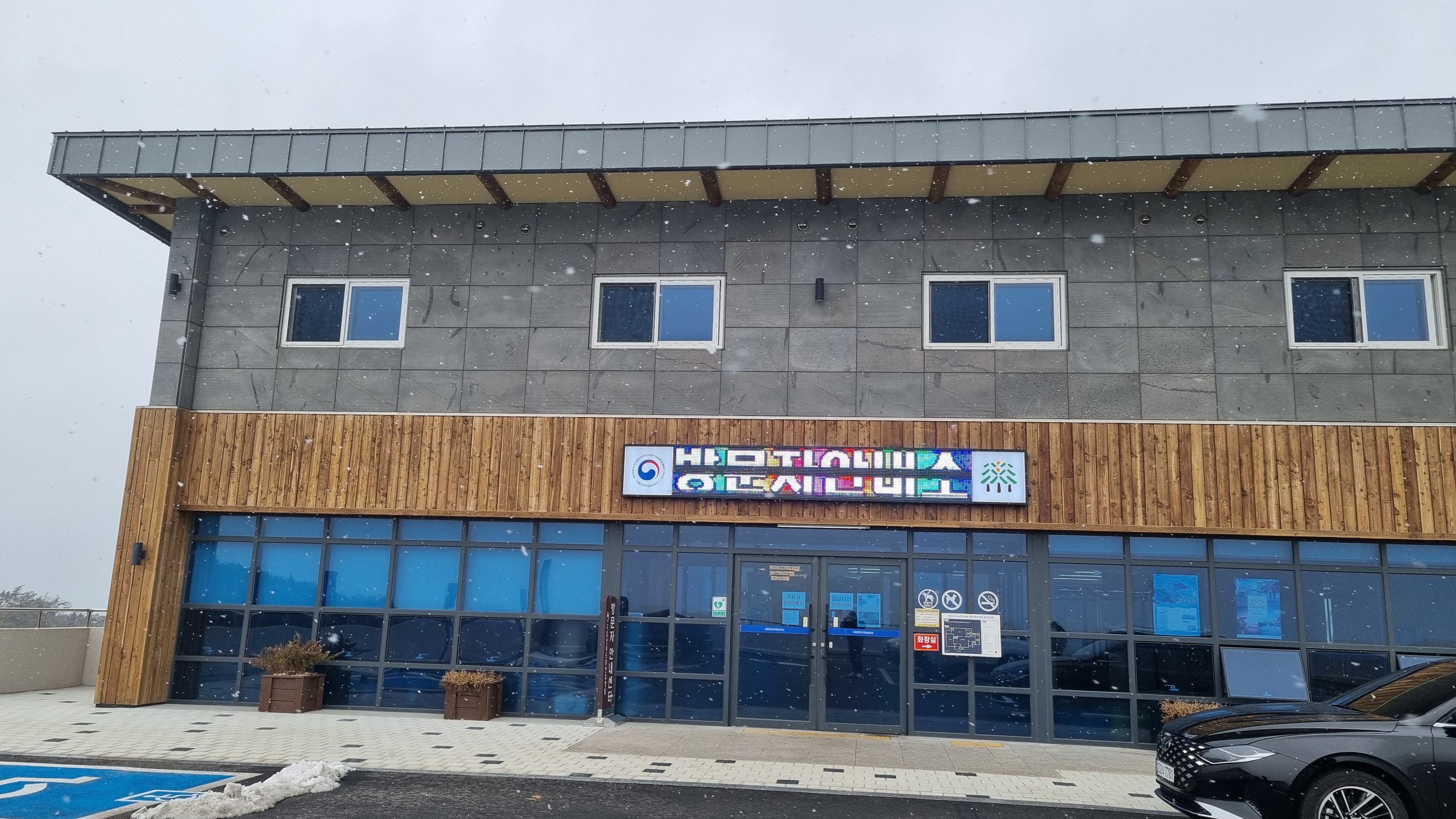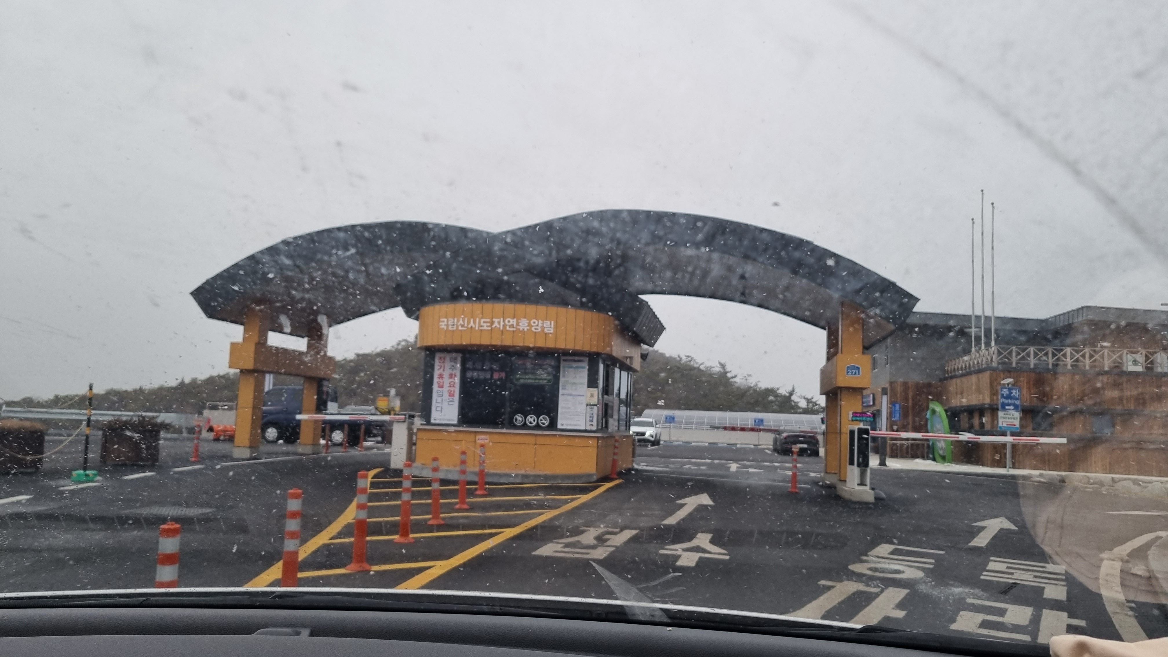 구불구불한 길을 따라 드디어 신시도자연휴양림 입구에 도착했습니다. 최근 개장한 곳이라 입구부터 깔끔하고 세련된 느낌이었습니다. 다른 휴양림과 달리 예약센터가 별도로 마련되어 있어 편리했습니다.