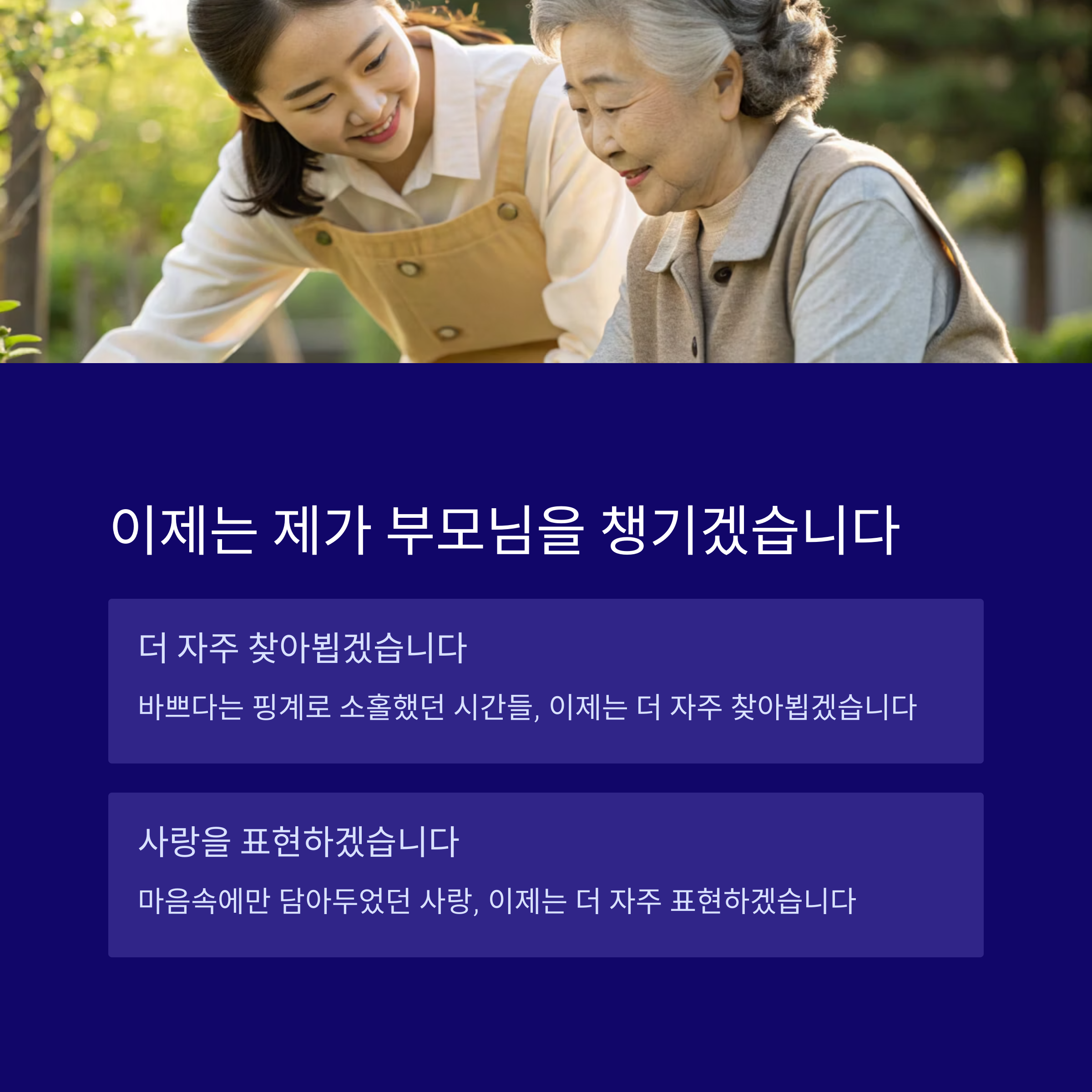 4. 요즘 들어 부모님께서 예전보다 조금씩 약해지시는 모습을 볼 때마다 마음이 아프기도 하고, 한편으로는 시간이 참 빠르다는 생각도 듭니다. 예전에는 부모님께서 저를 돌봐주셨지만, 이제는 제가 부모님을 더 챙기고 보살펴드려야 할 때가 온 것 같습니다. 남은 시간 동안 부모님께 더 많은 사랑을 드리고, 함께하는 추억을 많이 만들고 싶습니다.