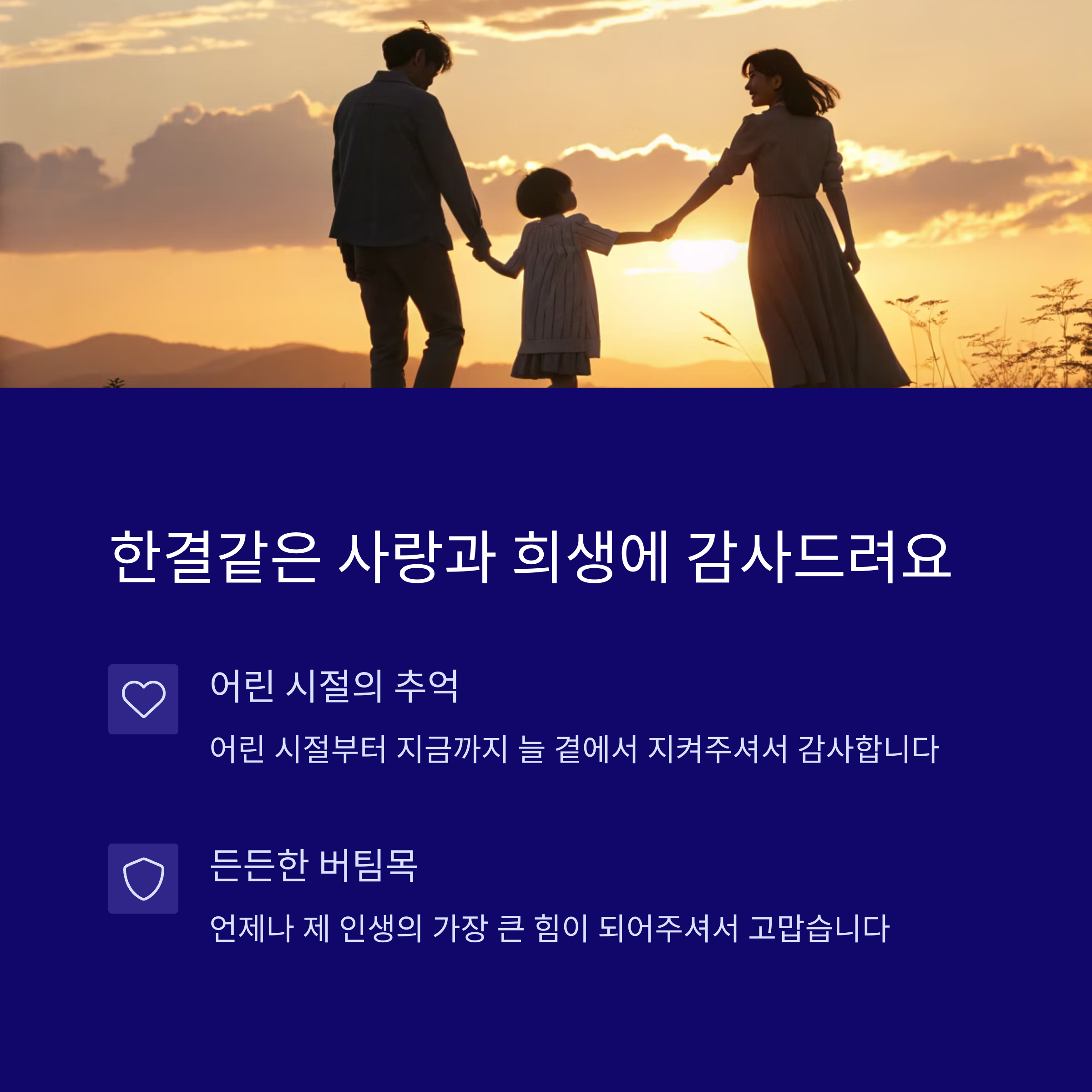 매일 새벽같이 일어나 가족을 위해 하루를 시작하셨던 모습, 힘든 일도 내색하지 않으시고 저희에게는 항상 밝은 얼굴을 보여주셨던 그 모습이 아직도 눈에 선합니다.