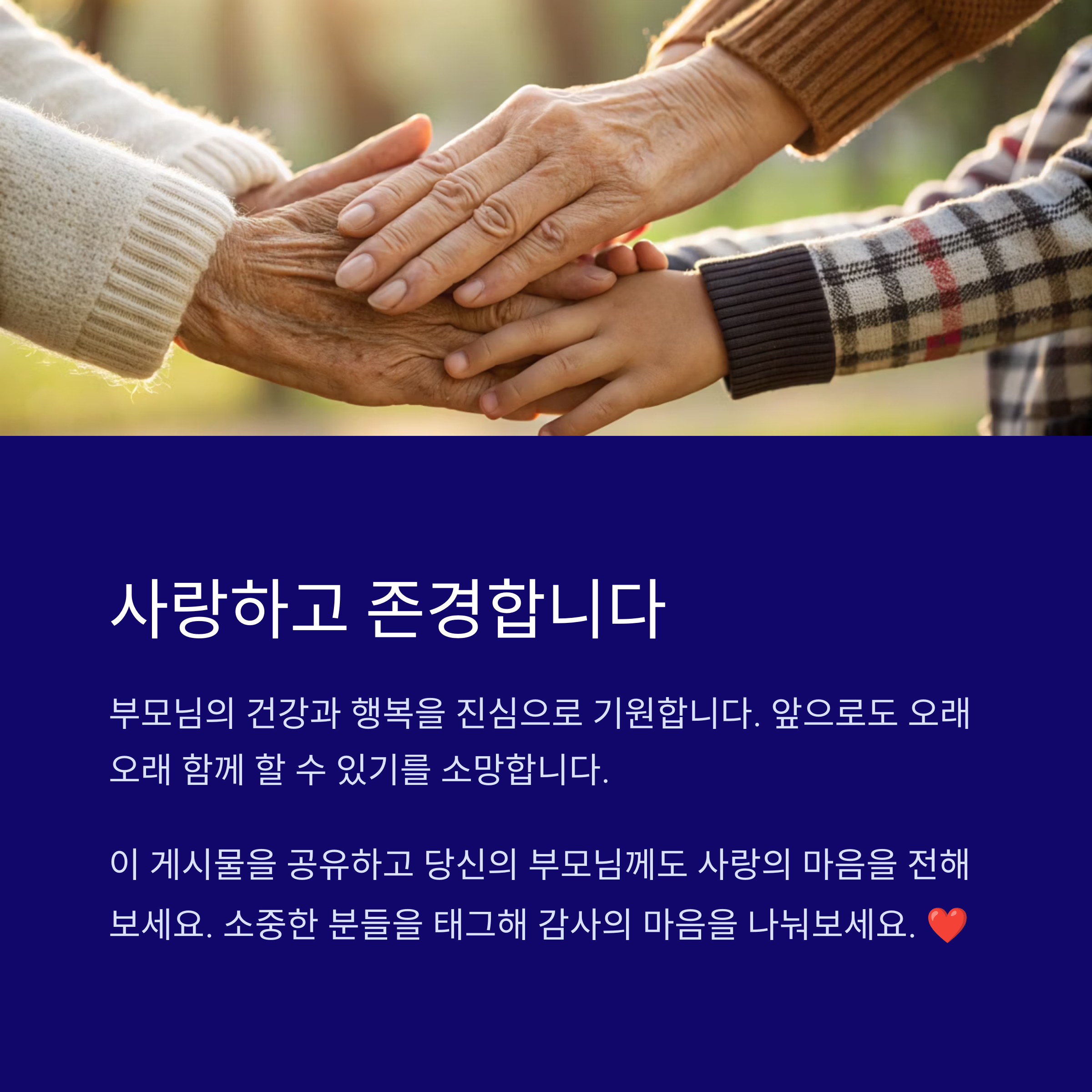 4. 요즘 들어 부모님께서 예전보다 조금씩 약해지시는 모습을 볼 때마다 마음이 아프기도 하고, 한편으로는 시간이 참 빠르다는 생각도 듭니다. 예전에는 부모님께서 저를 돌봐주셨지만, 이제는 제가 부모님을 더 챙기고 보살펴드려야 할 때가 온 것 같습니다. 남은 시간 동안 부모님께 더 많은 사랑을 드리고, 함께하는 추억을 많이 만들고 싶습니다.