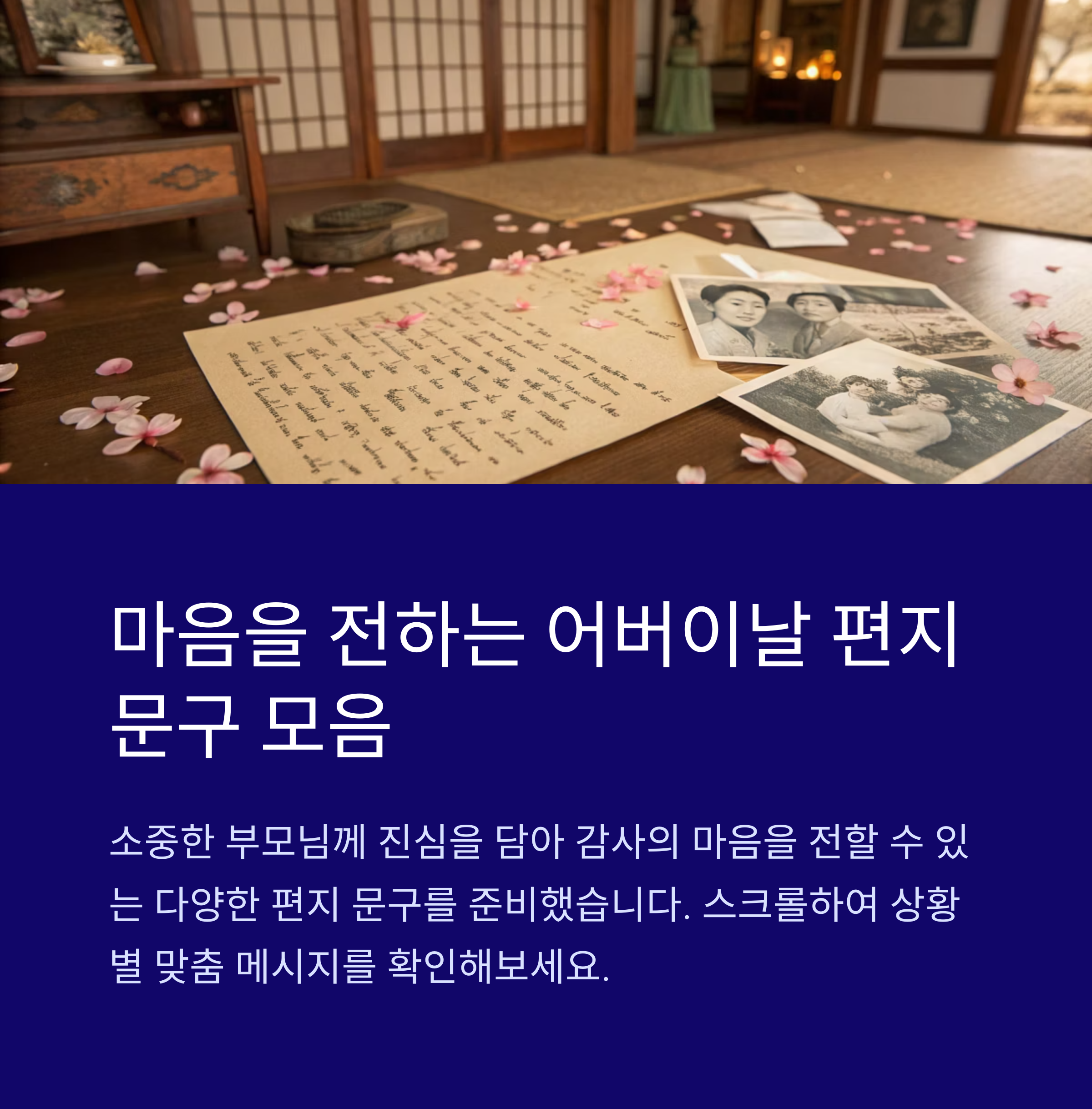 편지 한 장이 주는 따뜻한 울림은 어떤 선물보다 오래 남습니다. 정성스럽게 써내려간 진심의 문장이 올해 어버이날, 가장 큰 선물이 되기를 바랍니다. 오늘의 문구가 여러분의 마음을 전하는 데 조금이라도 도움이 되었으면 좋겠습니다.