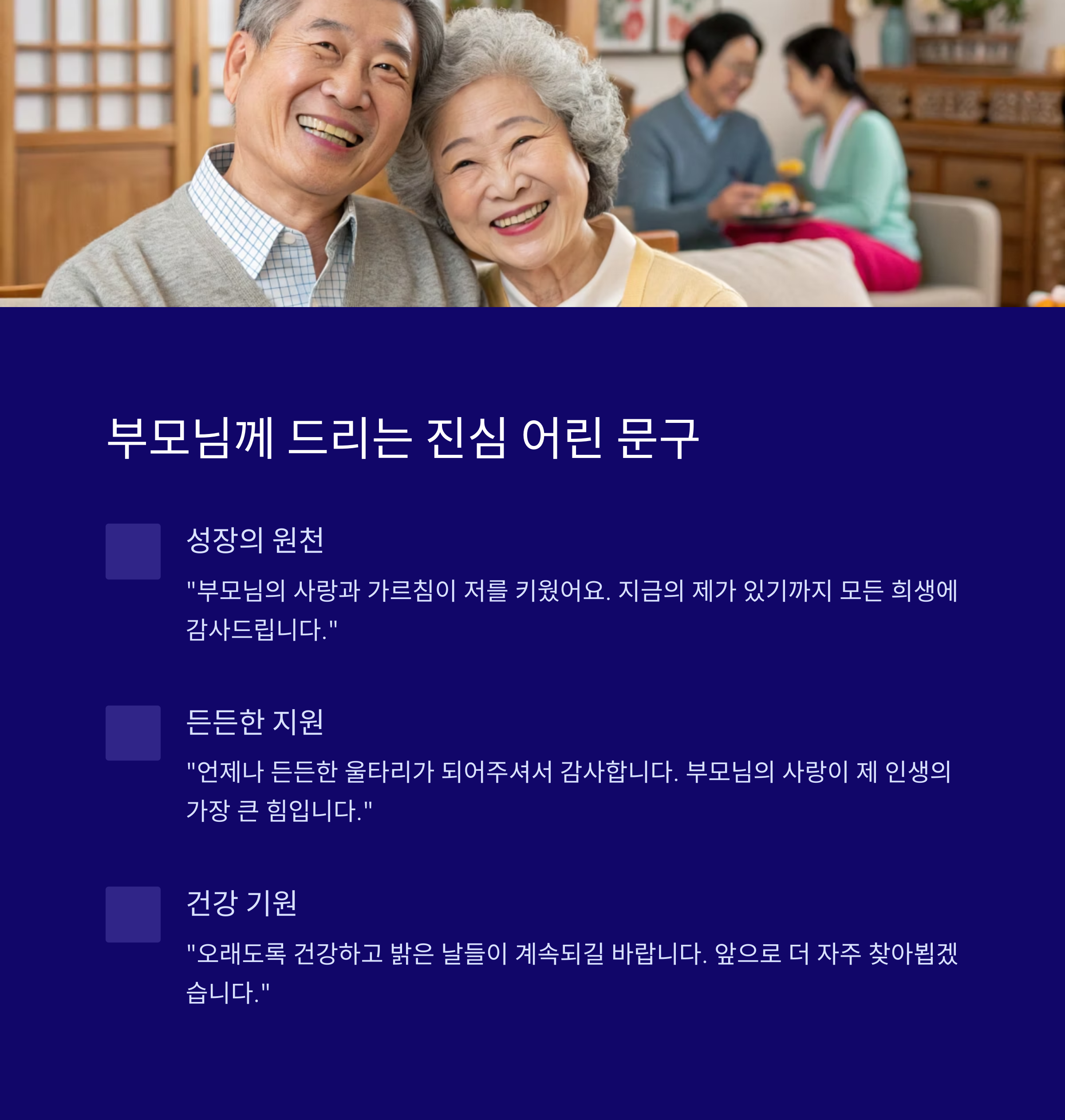 | 문구 구성 | 어버이별 1:1 맞춤 감성 편지형태 제공 |