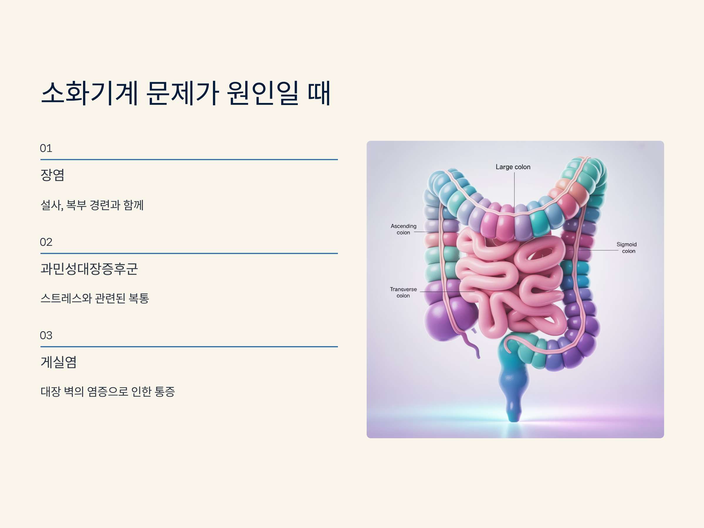 가장 먼저 생각해볼 수 있는 원인은 여성 생식기 관련 질환입니다. 자궁근종, 난소 낭종, 자궁내막증, 배란통 등이 대표적입니다. 특히 월경과 관계없이 통증이 지속되거나, 성관계 후 통증이 있다면 산부인과 진료를 받아보는 게 좋아요.