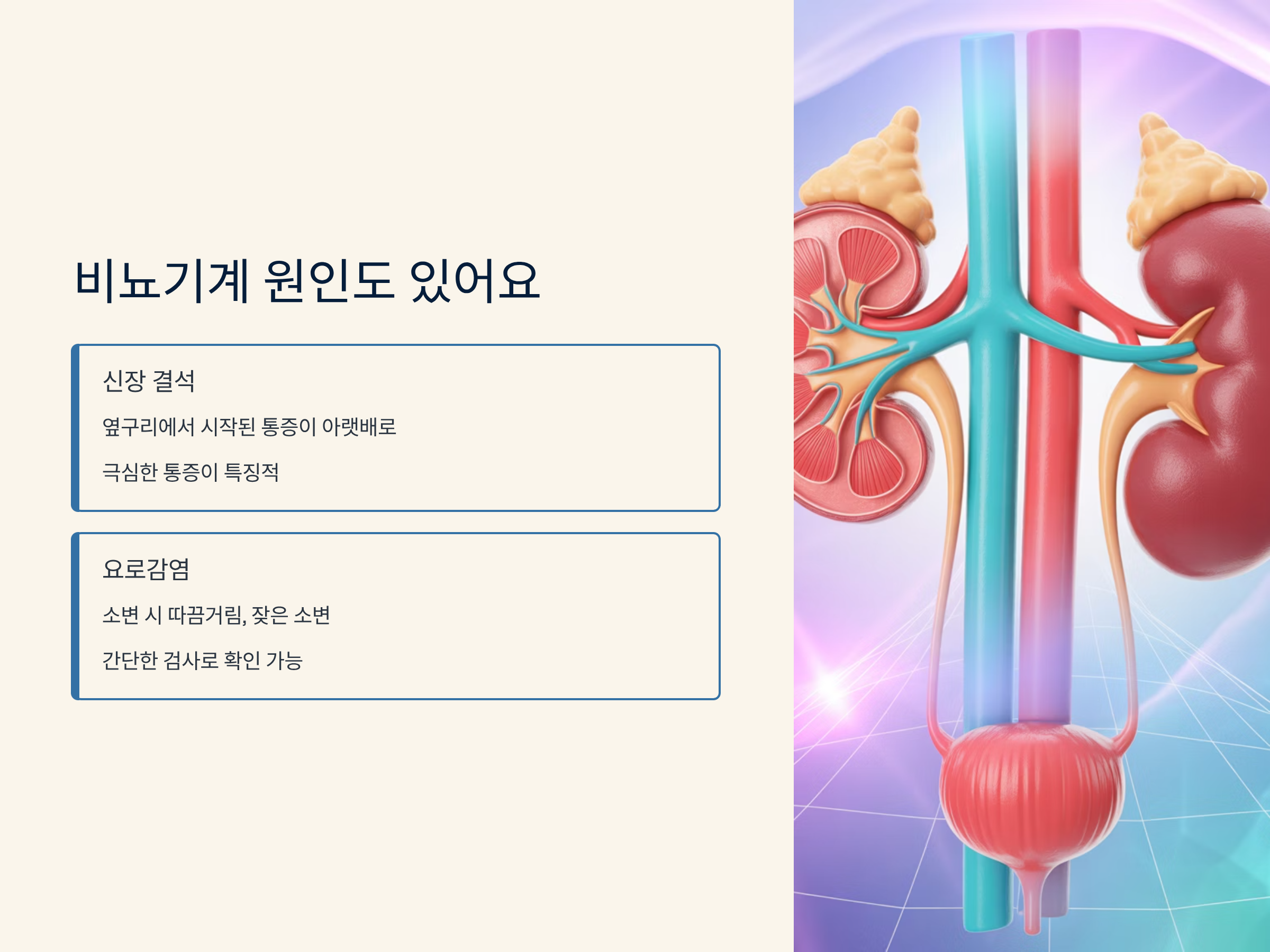 신장 결석이나 요로감염도 여자 왼쪽 아랫배 통증의 원인이 될 수 있어요. 소변을 볼 때 통증이 있거나, 잦은 소변이 나타나면 비뇨기과 진료가 필요합니다. 복부 초음파나 소변검사로 간단하게 확인 가능해요.