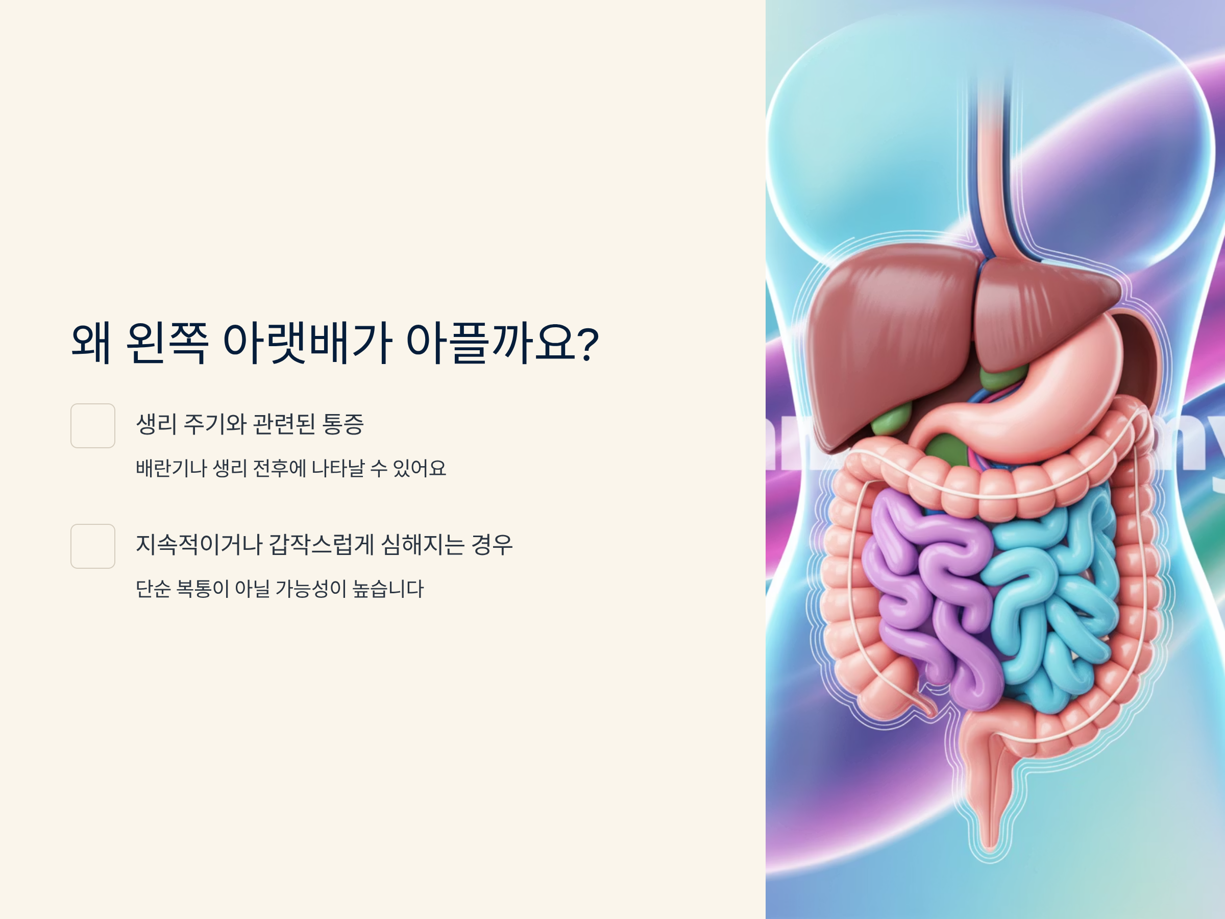 왼쪽 아랫배 통증은 여성에게 비교적 흔한 증상입니다. 생리 전후, 배란기에도 나타날 수 있지만 지속되거나 갑자기 심해지면 주의해야 해요. 저도 예전에 단순 복통인 줄 알았다가 난소 낭종 진단을 받았던 적이 있거든요.