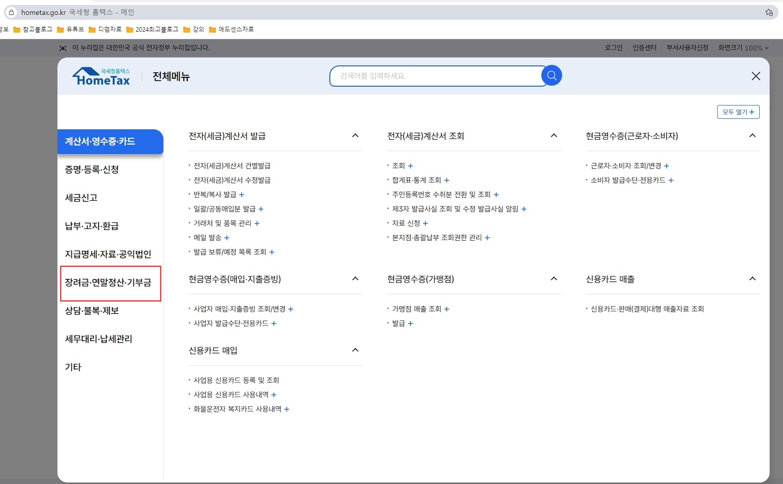 위 화면이 나오면좌측 6번째 메뉴에 '장려금.연말정산.기부금' 카테고리가 보일것입니다. 여기를 누르십시요.