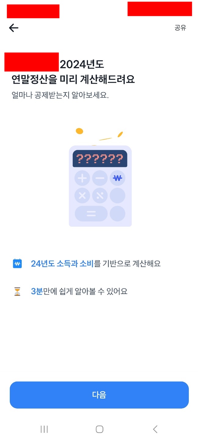 토스에 접속하여 메뉴를 찾기 어렵기 때문에 검색창에서 '연말정산'을 누르면 위와같이 2024년 연말정산 미리계산해주겠다는 내용이 나옵니다. 다음을 누릅니다.