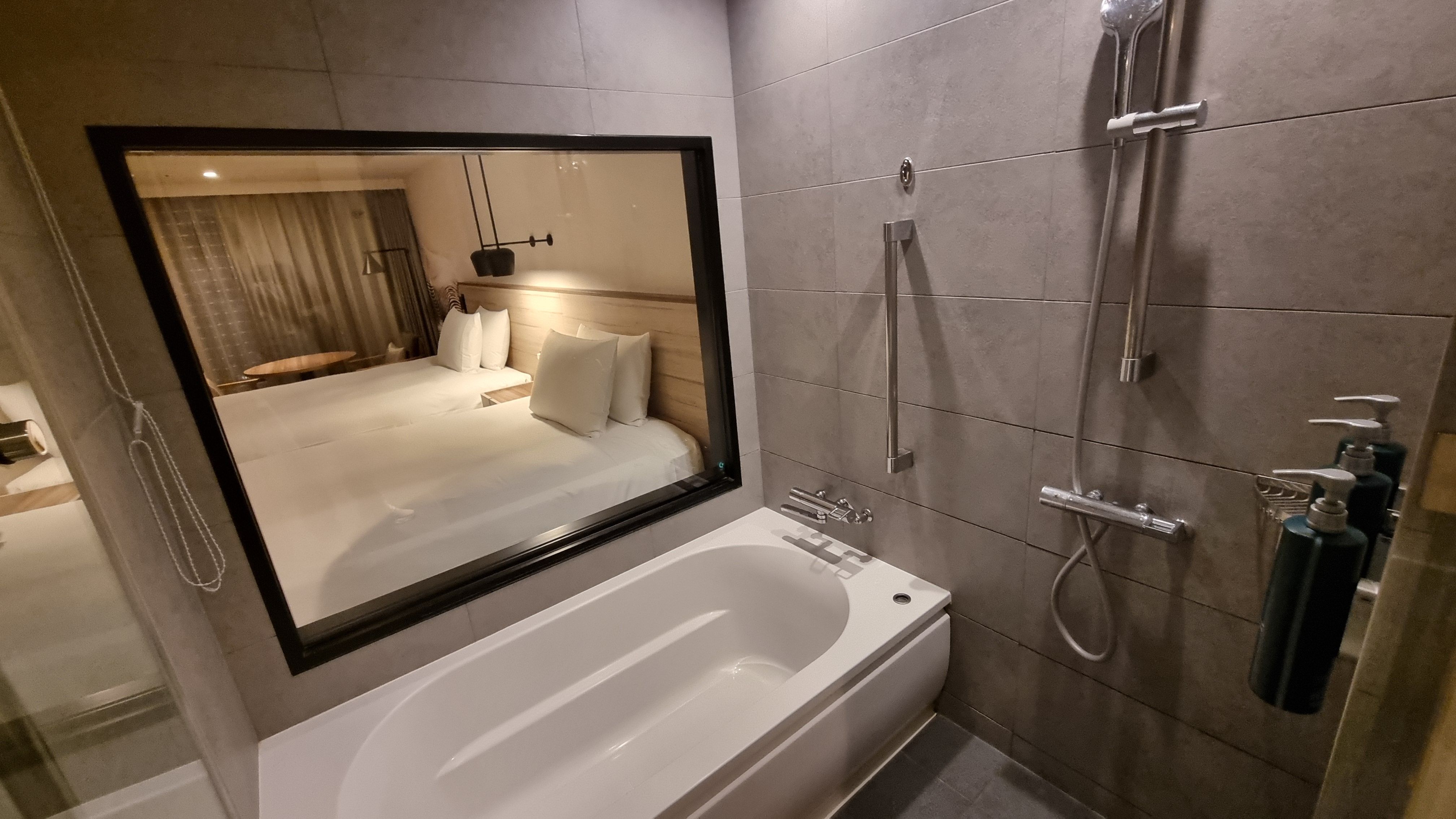 욕실에 모습입니다. 우리나라에서는 많이 사라진 컨셉같은데 침대에서 욕실이 보여요. 물론 블라인드가 있으니 걱정마세요.