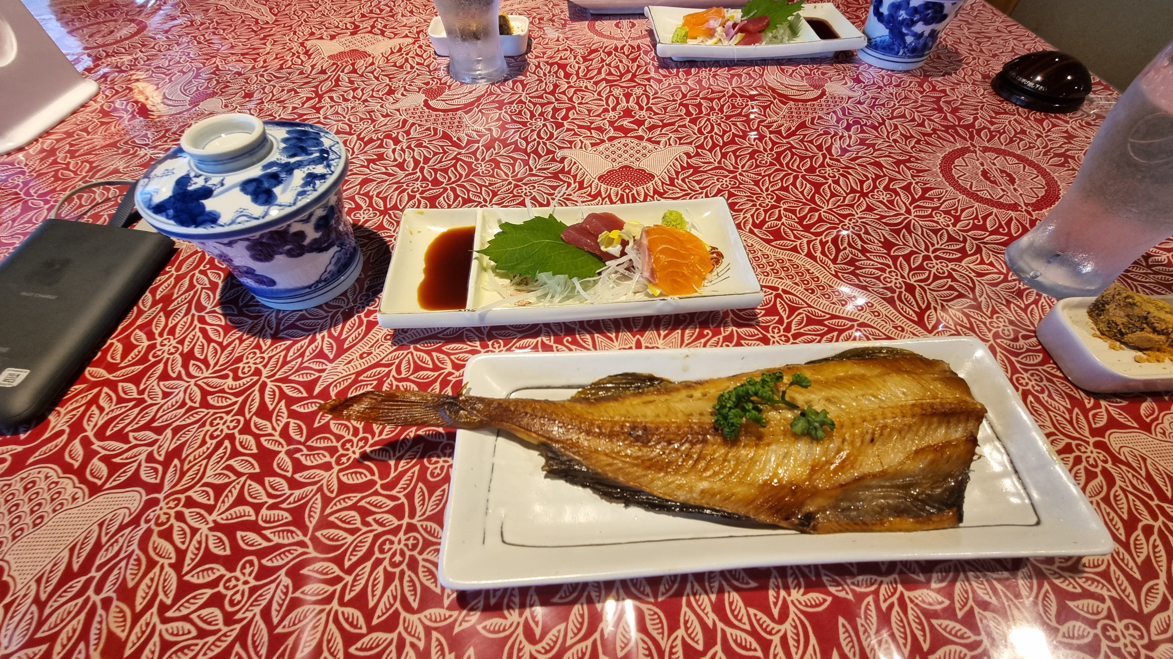 앉자마자 준비된 음식들이 나오기 시작했는데요, 일단 큼직막한 생선 한마리가 구워져 나오고 연어와 참치회 한점씩이 소담스럽게 담겨져 나옵니다.