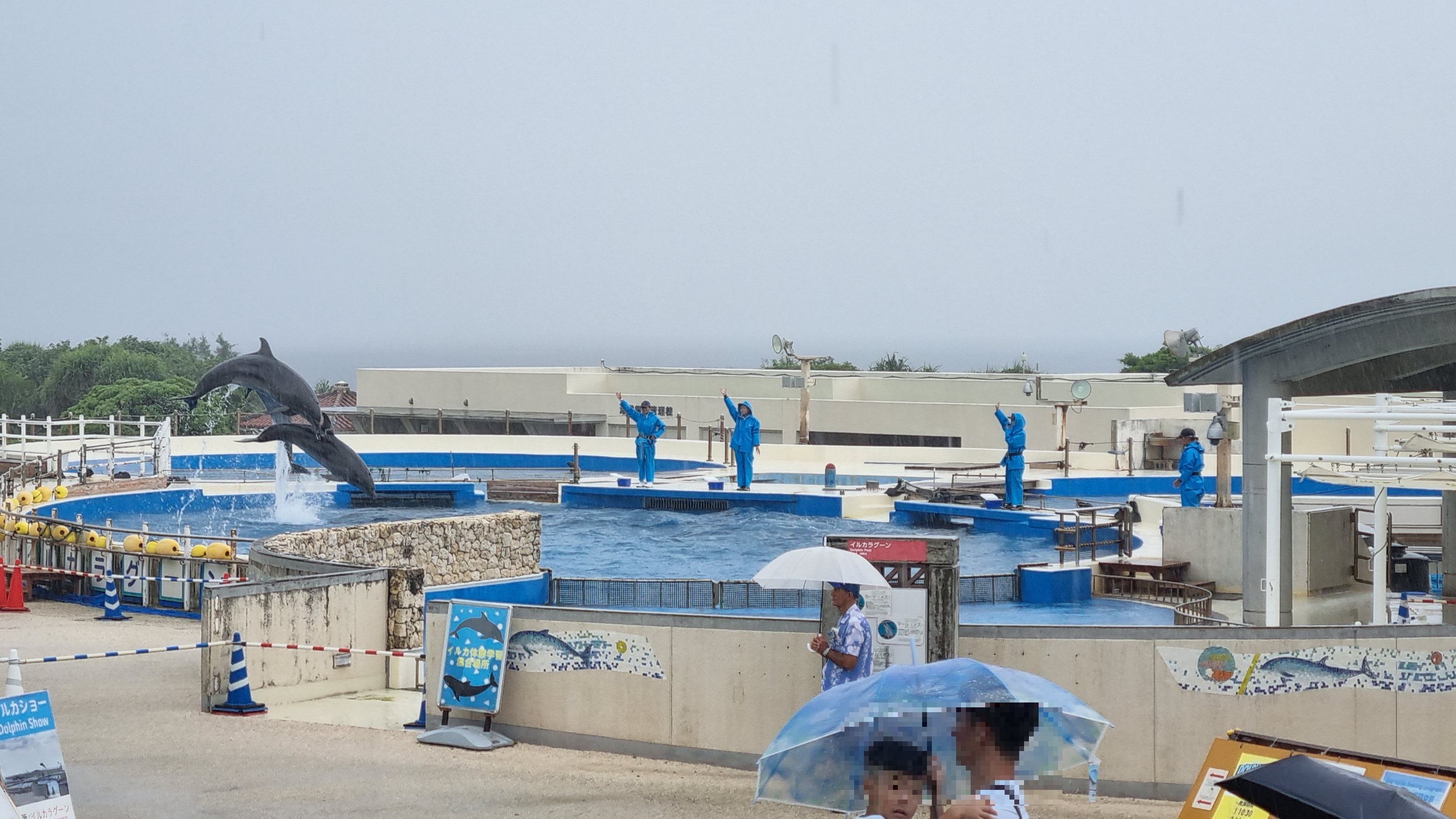 귀여운 돌고래들이 높이 점프하고, 동물 트레이너들과 교감하는 모습이 인상적이었어요. 특히 마지막에는 돌고래들이 인사하는 퍼포먼스까지! 어린이부터 어른까지 모두가 즐길 수 있는 멋진 쇼였지만 우비를 착용해도 폭우로 온몸이 젖어서 가까이에서 돌고래쇼를 감상하지 못한것은 아쉬운 부분입니다.