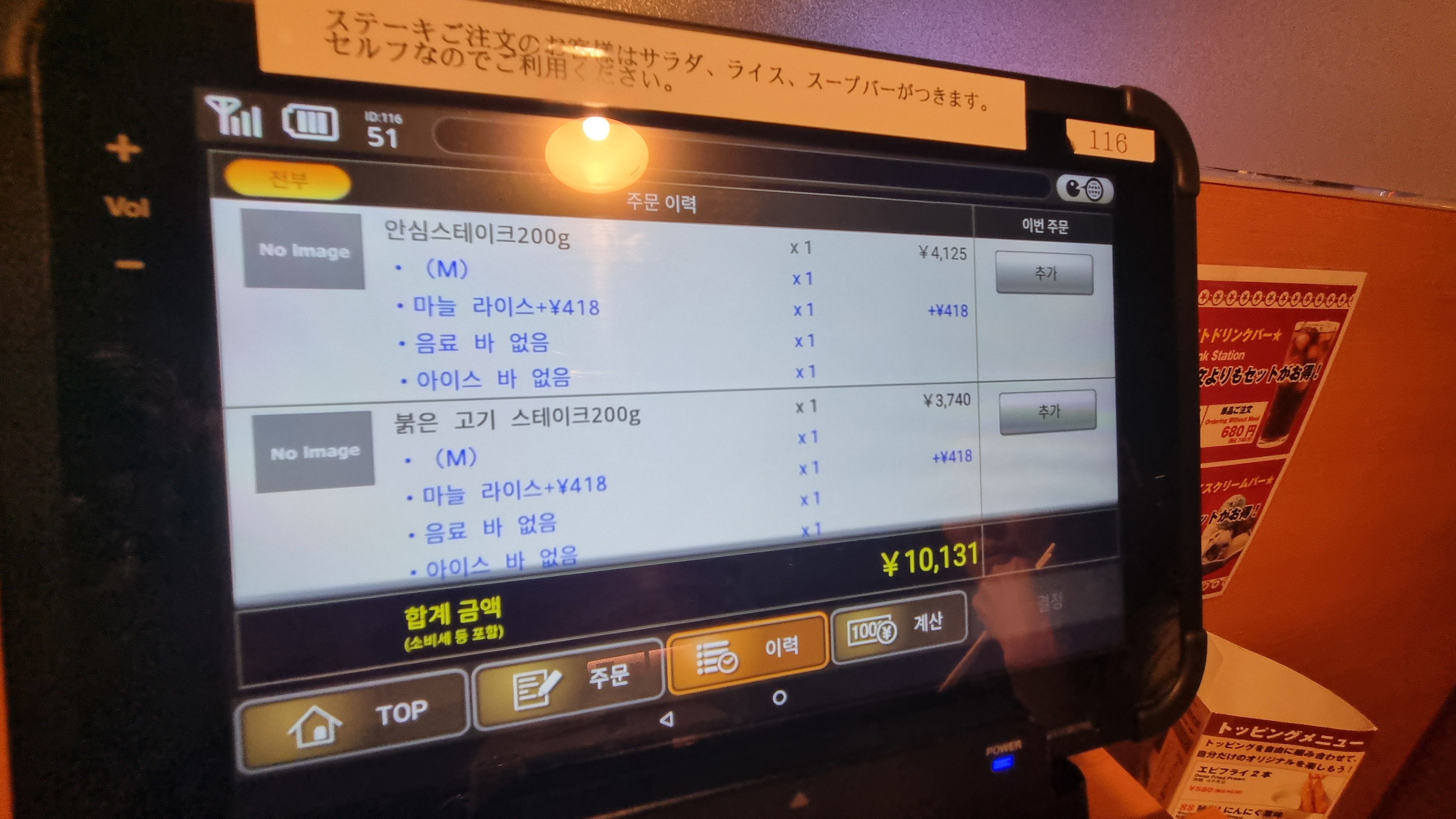 그런데 걱정할 필요가 없답니다. 한글로도 메뉴판이 나오거든요.. 물론 안심스테이크는 알아먹겠는데 붉은고기 스테이크라고 나오니 뭘까 싶었는데, 가격을 보니 아마도 기본 메뉴인거 같더라구요. 그래서 각각 하나씩 주문했고 1만엔이 조금 넘네요.