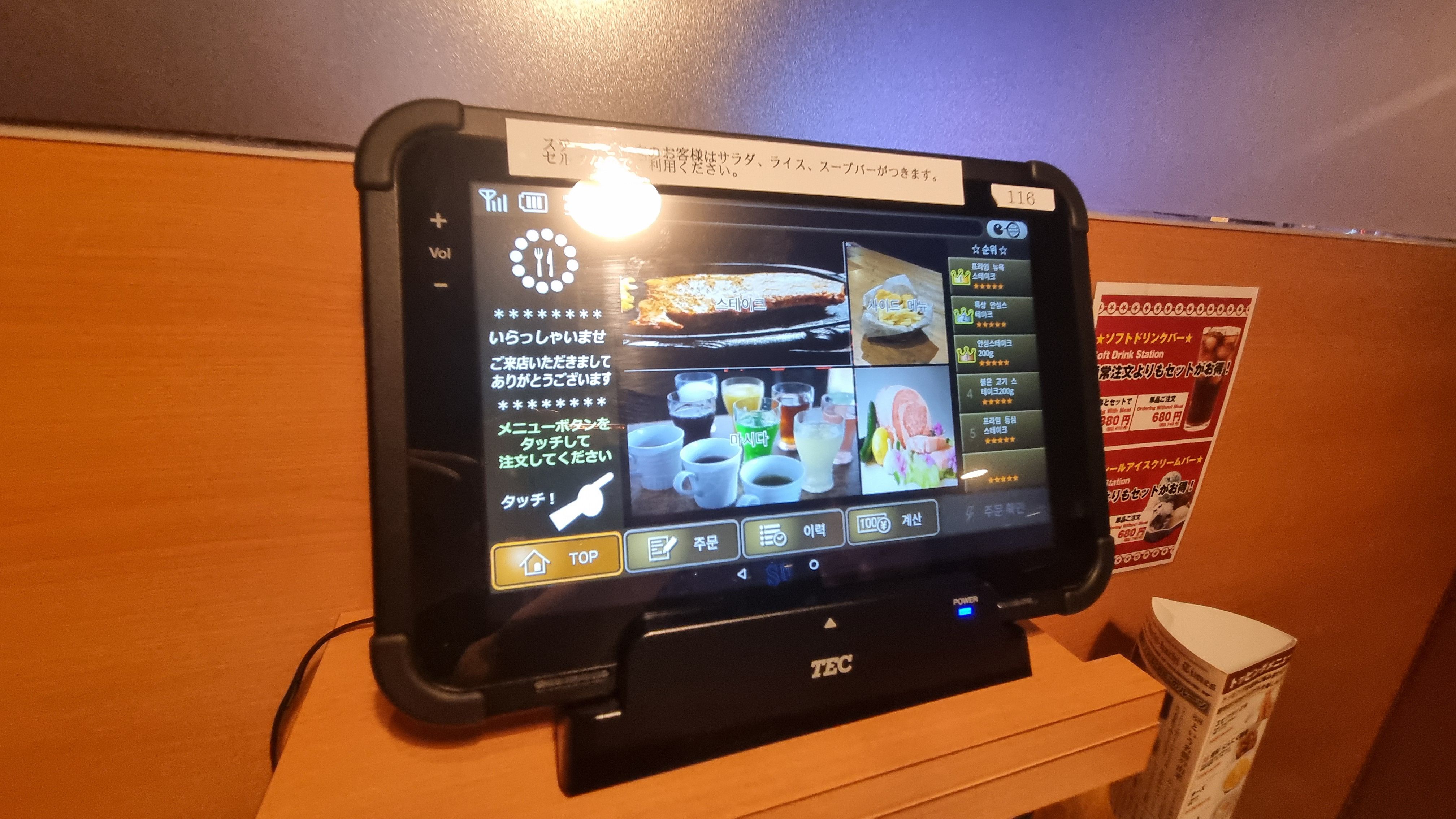 오키나와 88스테이크 주문방법은 서빙을 받는 형식이 아니라 이처럼 테이블에 설치된 키오스크를 통해 주문을 하는 방식입니다. 저희 부부는 일본어를 전혀 할 줄 모르기 때문에 일본어가 나와있는 화면을보고 일단 당황했죠.