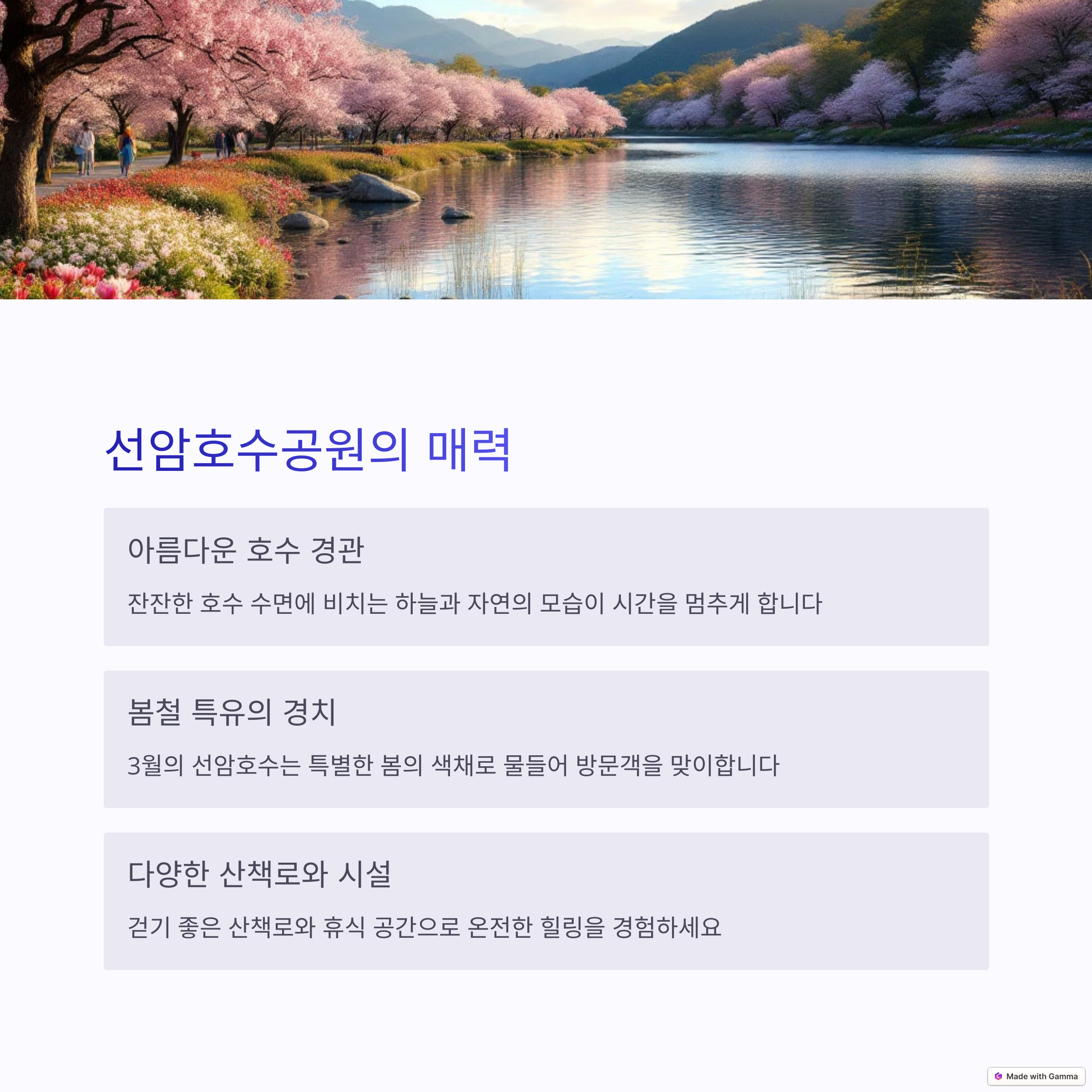 선암호수공원은 울산 남구에 위치한 공원으로, 호수를 중심으로 아름다운 산책로와 다양한 시설들이 있어 봄철에 특히 아름답습니다. 이곳은 무료로 개방되어 연중무휴로 운영되며, 많은 사람들이 산책과 운동을 즐기기 위해 찾습니다. 호수 주변에서 산책을 즐기며 자연의 아름다움에 빠져들 수 있습니다. 특히 봄철에 호수 주변의 경관은 더욱 아름다워 많은 사람들이 이곳에서 봄의 기운을 느낍니다.