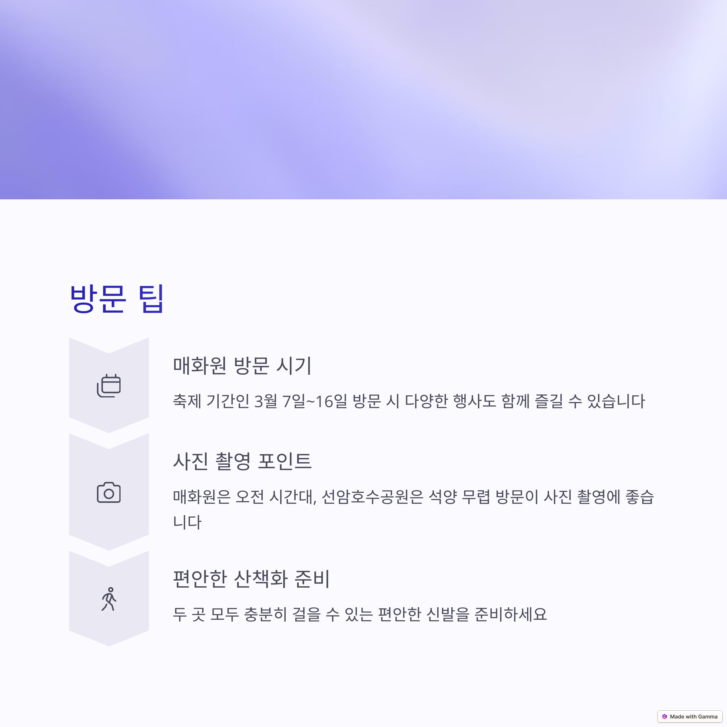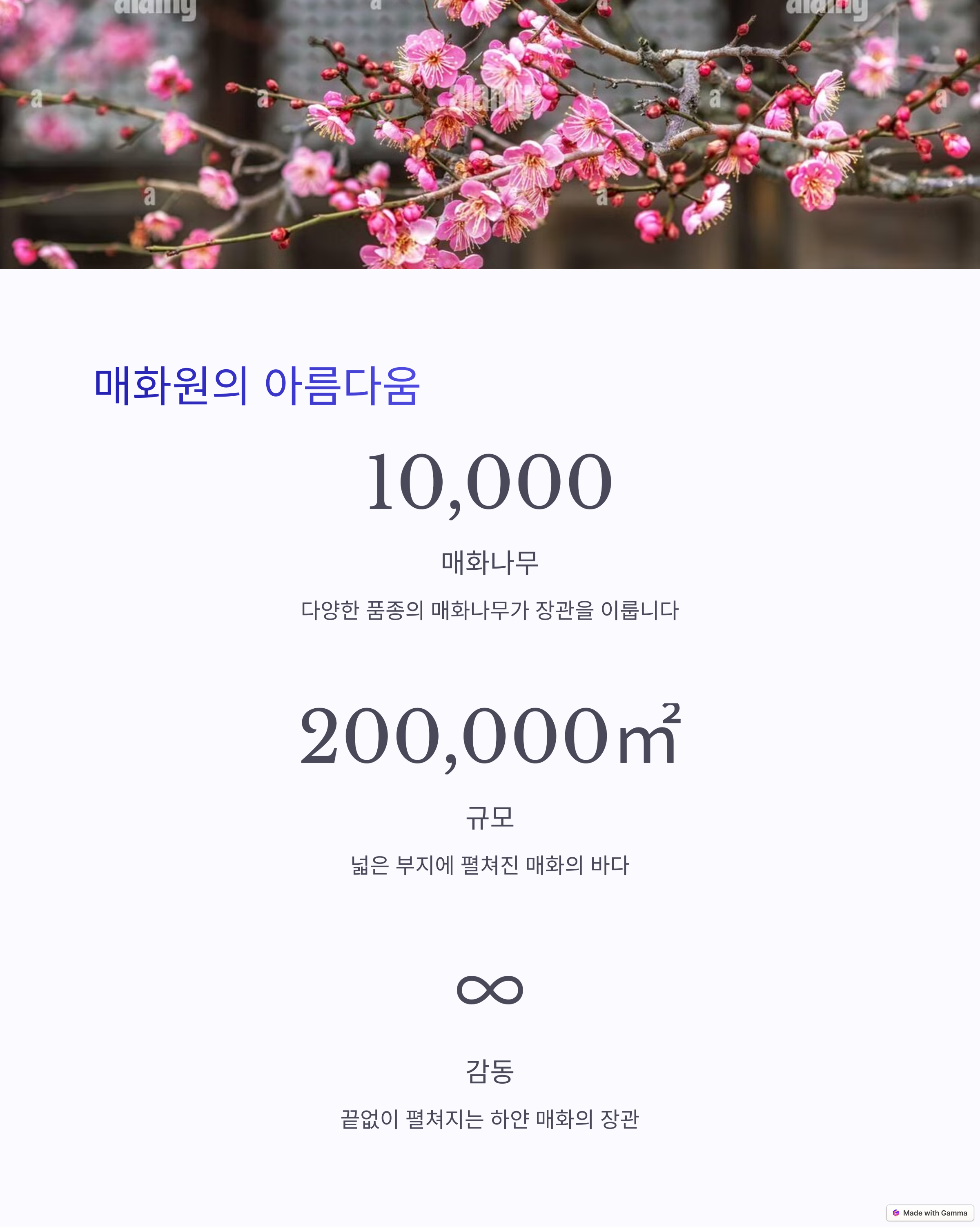 | 광양 매화축제와 연계된 아름다운 매화 | 무료 개방, 연중무휴로 운영되는 공원 | 봄철 여행지로 적합한 명소들 |