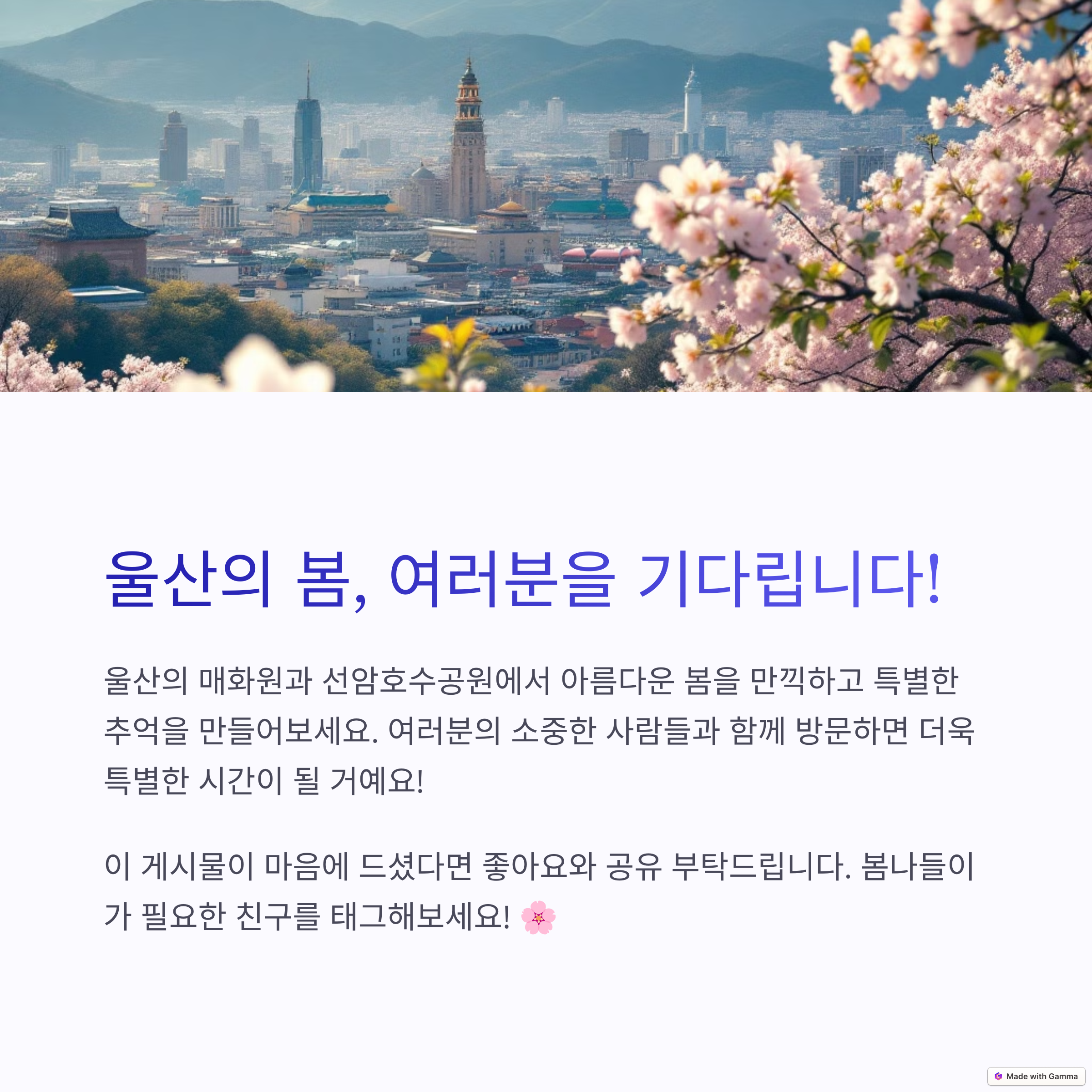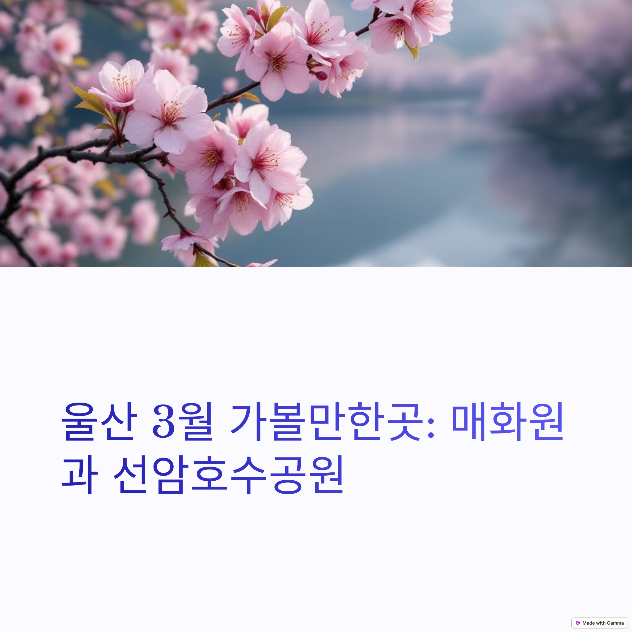 | 매화의 아름다움을 만끽할 수 있는 장소 | 호수 주변을 산책하며 봄의 기운을 느낄 수 있는 곳 | 울산의 봄을 대표하는 두 명소 |