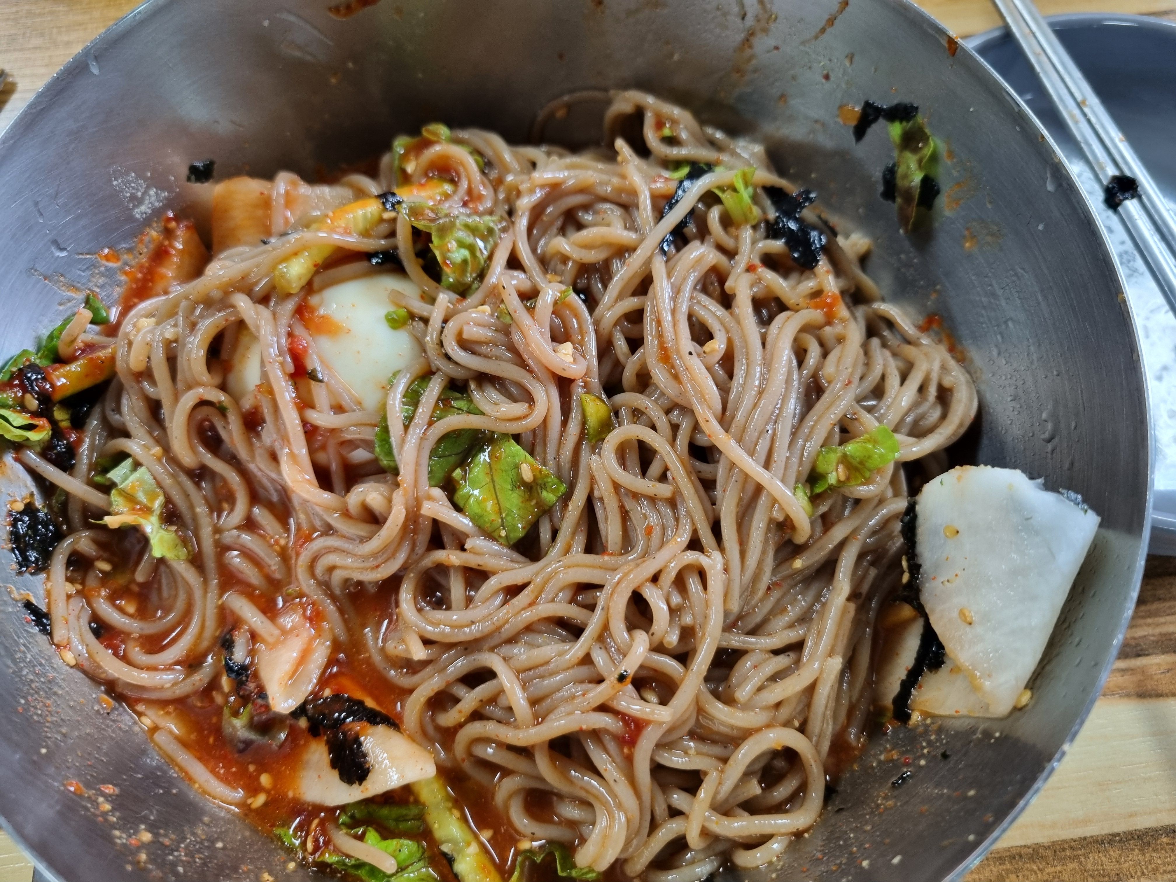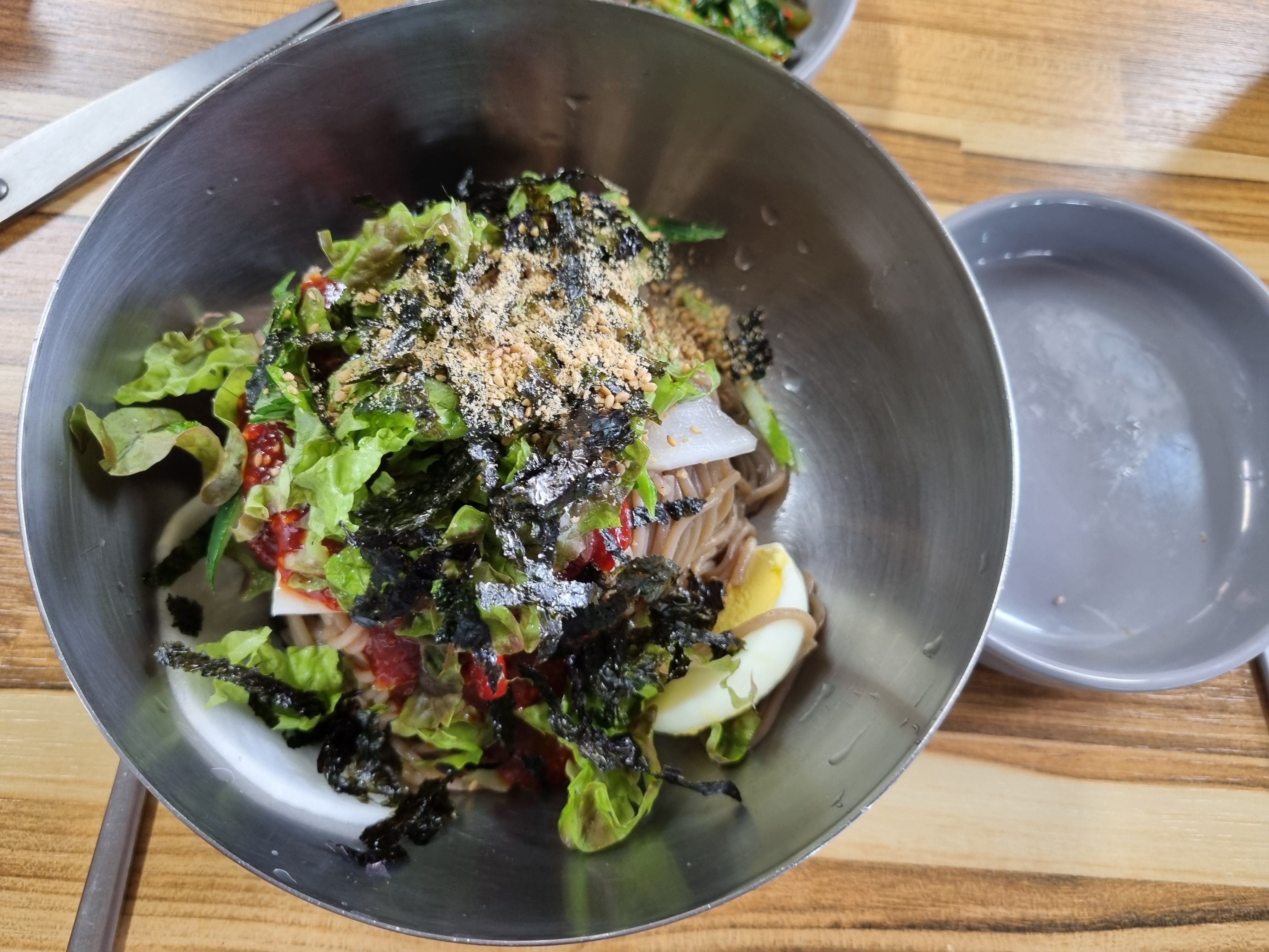 비빔 막국수 비쥬얼입니다. 상추에 콩가루 달콤한 양념장에 식초 몇방울, 겨자좀 넣어주면 그냥 끝이죠.