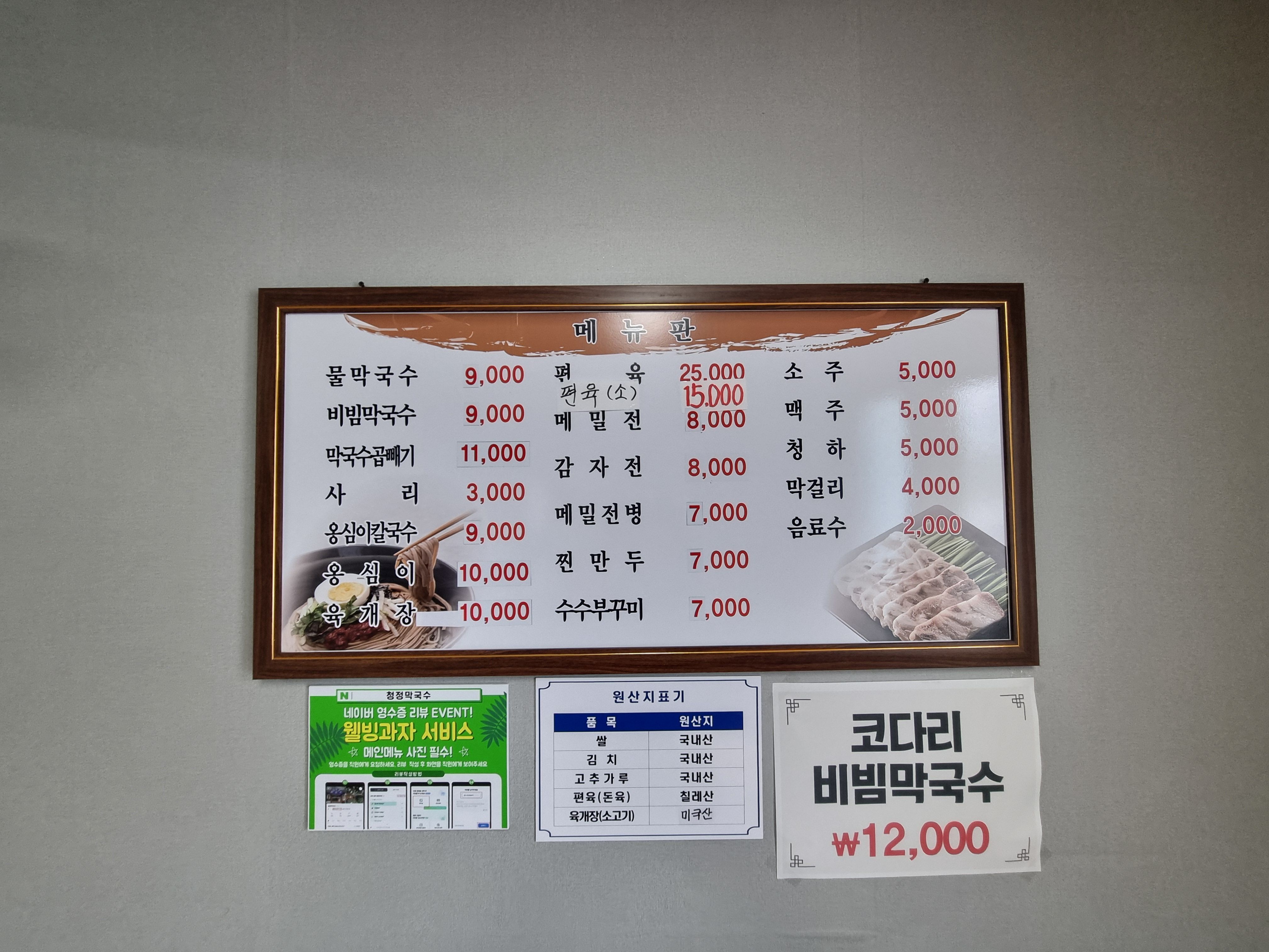 원주 금대리 막국수 맛집 청정막국수 메뉴입니다. 가격도 무난하고 막국수에는 편육이 궁합이 잘맞죠. 감자전도 추가하고 싶었지마 마눌님에게 혼이 나서 이번에는 패스~