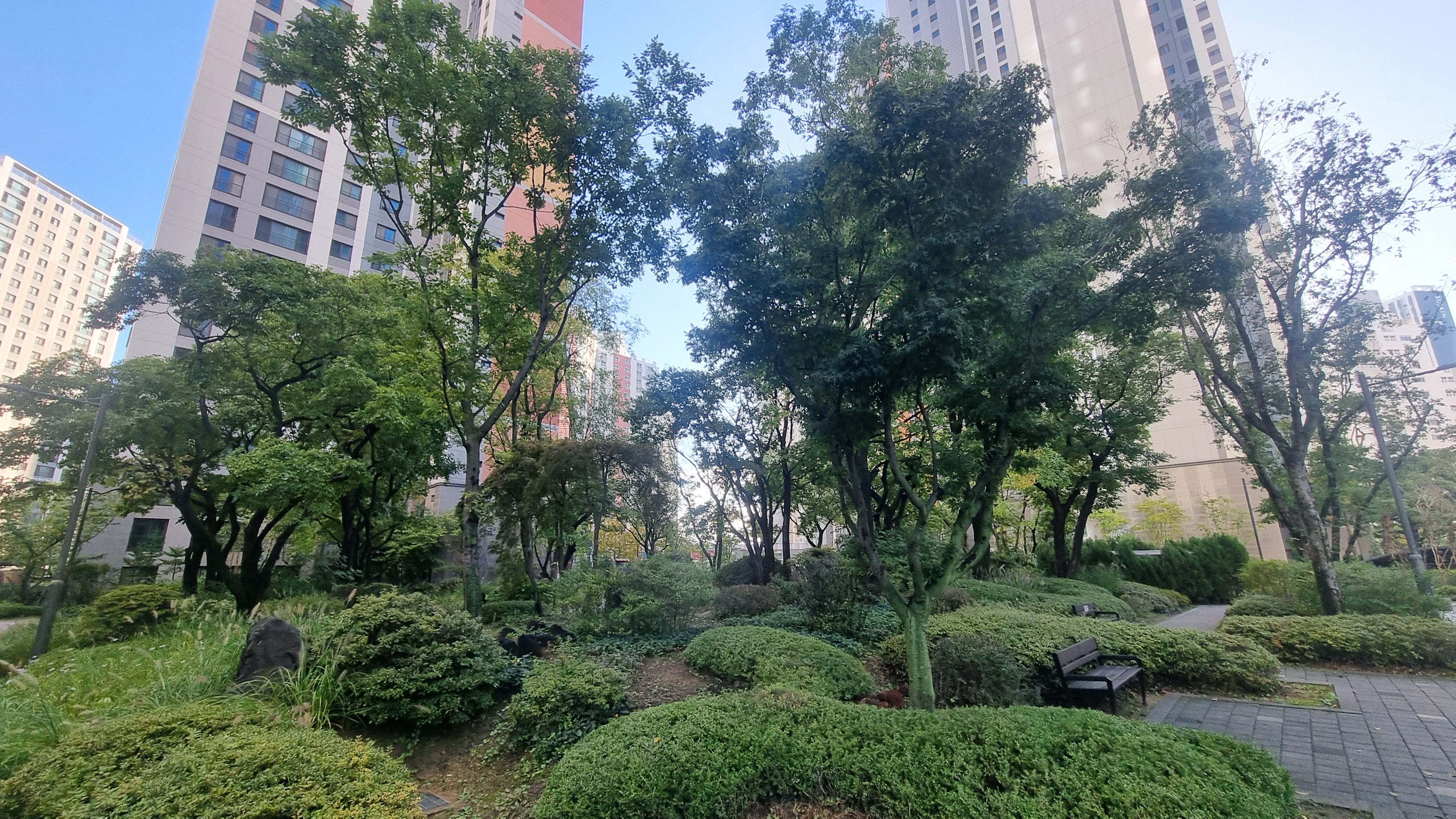 동간 거리가 넓어 프라이버시가 확보되고, 중앙에는 산책로와 커뮤니티 정원, 어린이 놀이터 등이 조성되어 있습니다.