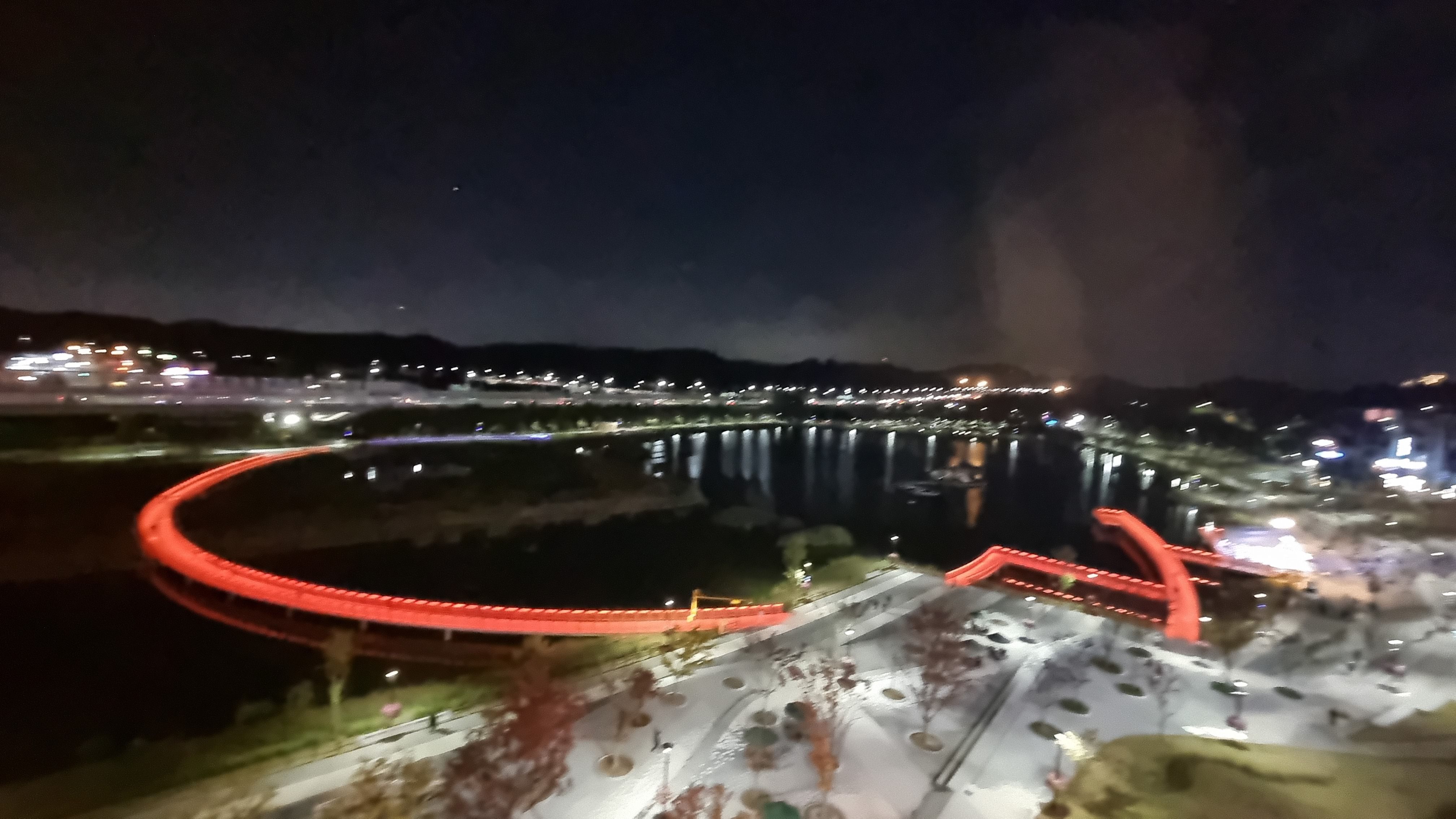 루프탑에서바라본 은계호수공원과 야경입니다 빵 맞집은 모르겠고 뷰 맛집은 맞네요. 호수를 가로지르는 데크길에 붉은빛이 인상적입니다.