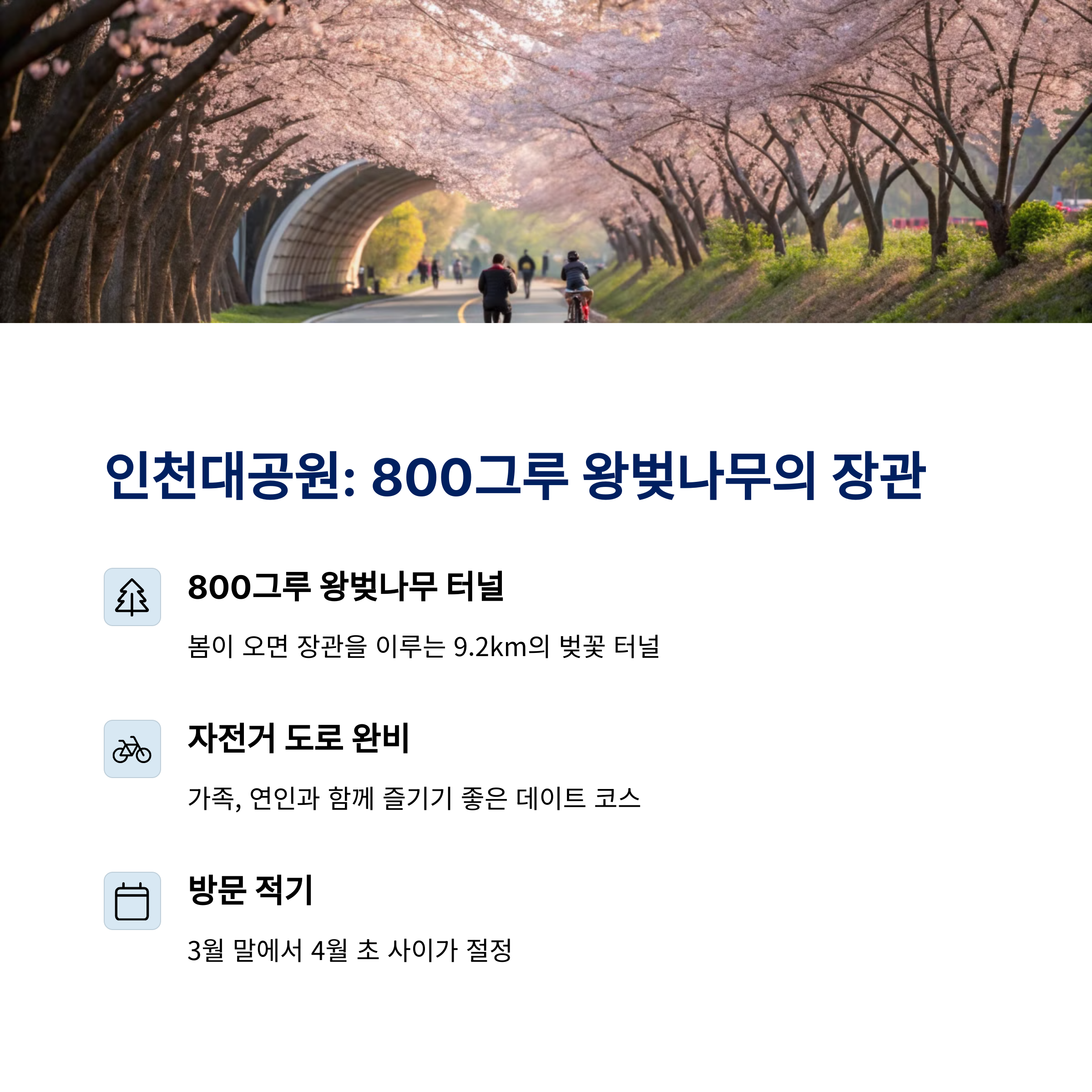 인천은 대공원부터 섬 속 공원까지 다양한 벚꽃 명소를 갖추고 있어, 매년 봄이면 지역 주민은 물론 관광객들에게도 인기를 끌고 있습니다. 각 장소는 고유의 분위기와 특색을 지니고 있어, 하루에 여러 곳을 이어 방문해보는 것도 좋은 방법이죠.