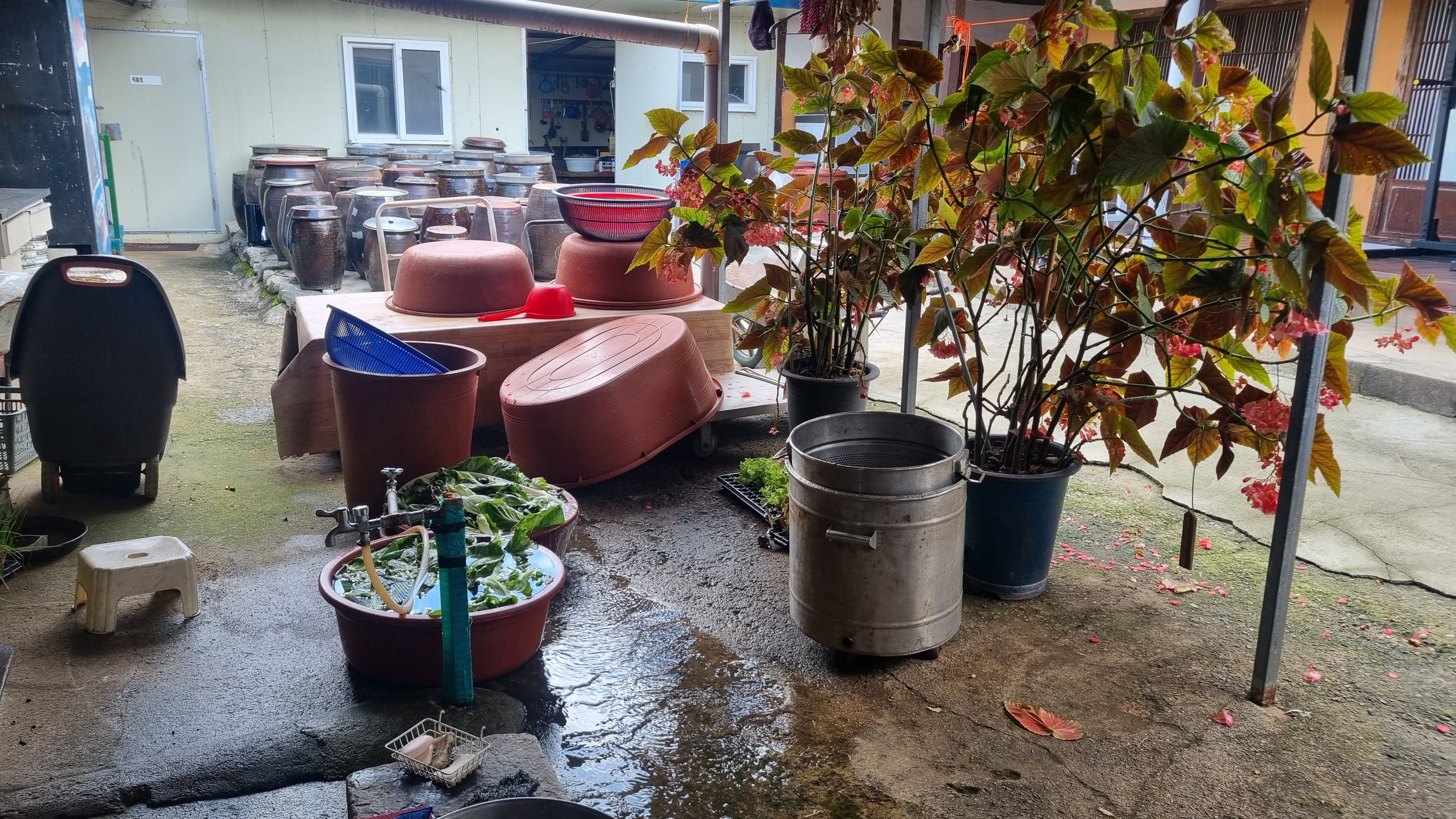 나무 기둥과 오래된 의자, 벽면 장식품들이 정겨운 분위기를 자아냅니다. 식사를 마치고 문을 나서면 시골집 마당 같은 풍경이 펼쳐져, 잠시 앉아 쉬거나 사진을 찍기에도 좋습니다.