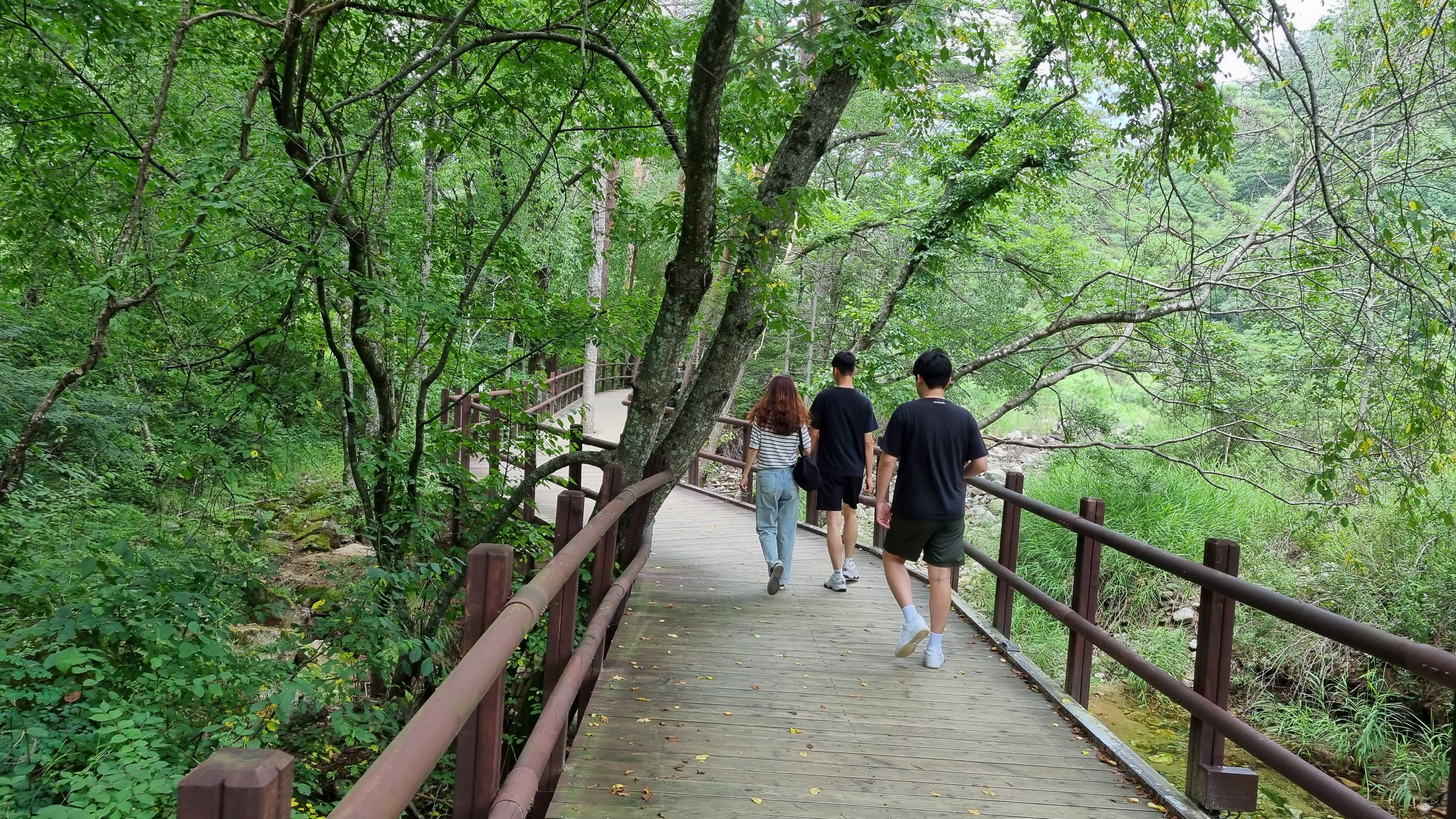 길을 따라 흐르는 계곡물과 징검다리, 목재 데크가 걷는 재미를 더해줍니다.