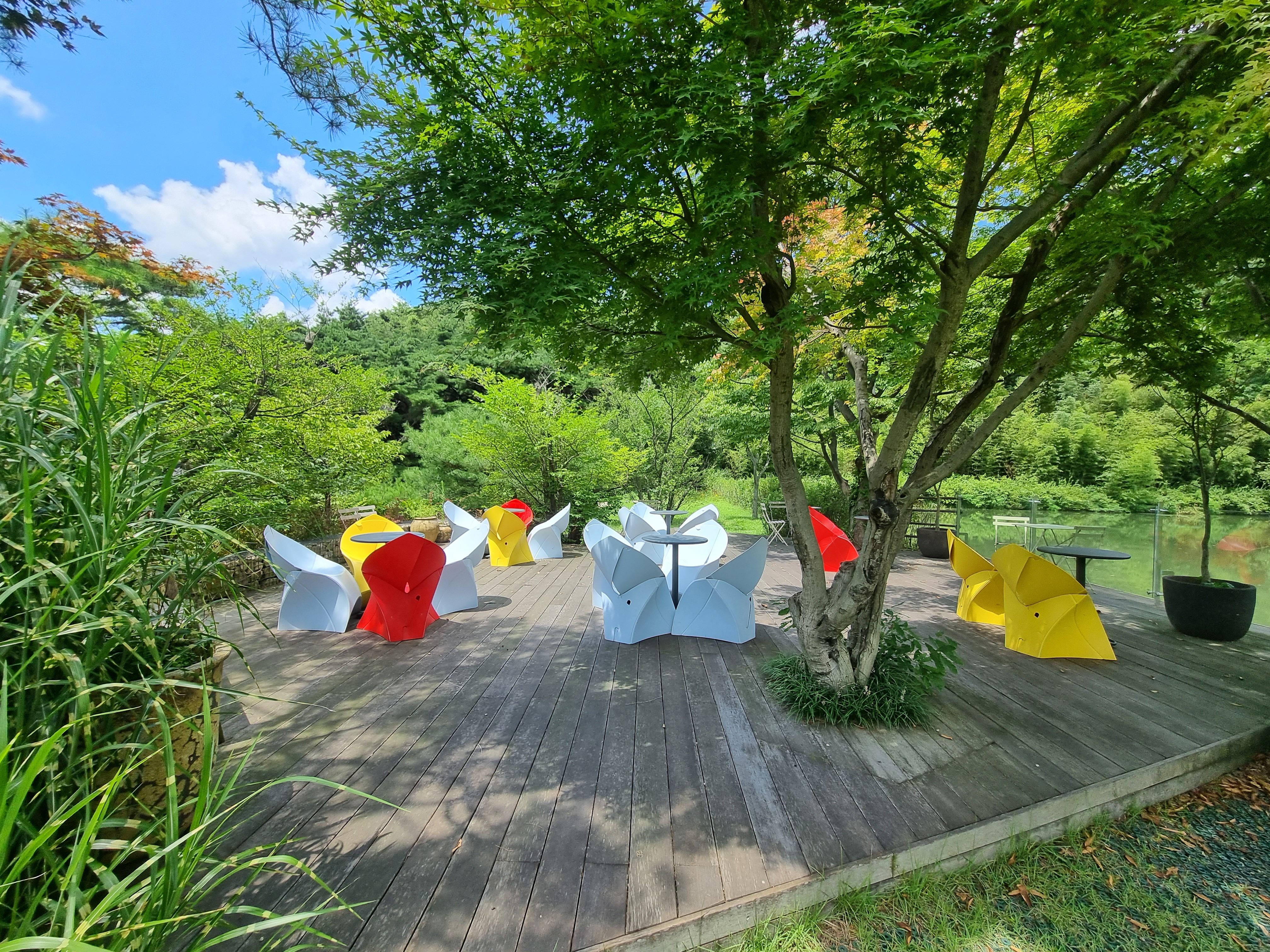 이제 밖으로가 연못으로 가보죠. 연못앞에 예쁜의자가 있어서 조금있으면 솔솔 바람이 불적에 여기서 커피 한잔, 상상만해도 좋네요.
