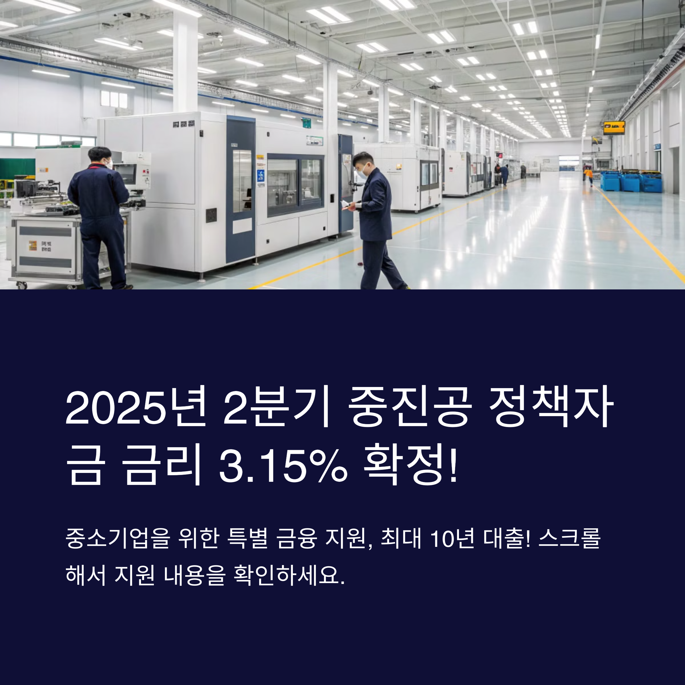 | 2025년 2분기 기준 3.15% | 최대 10년 (거치 4년 포함) | 유망기업, 정책연계, 성실경영 등 최대 0.4%p 인하 |