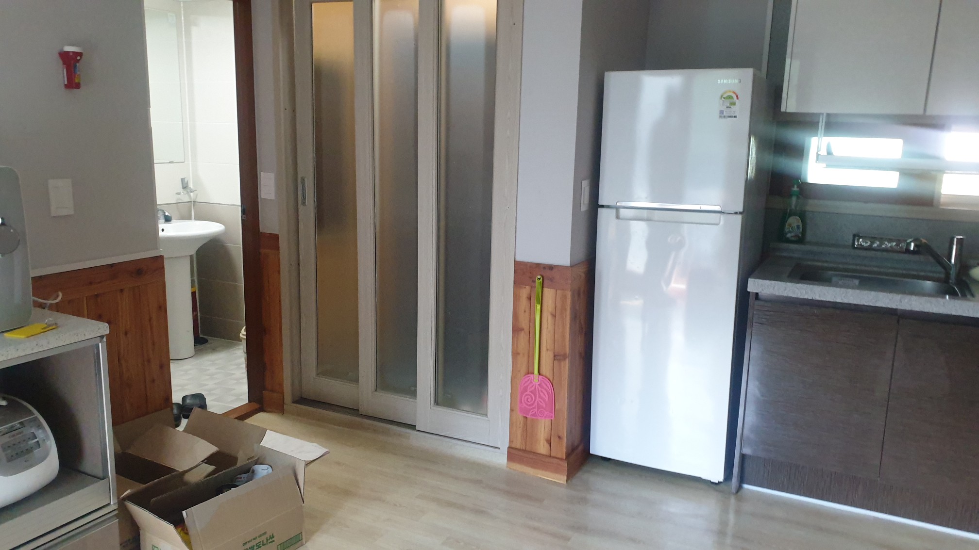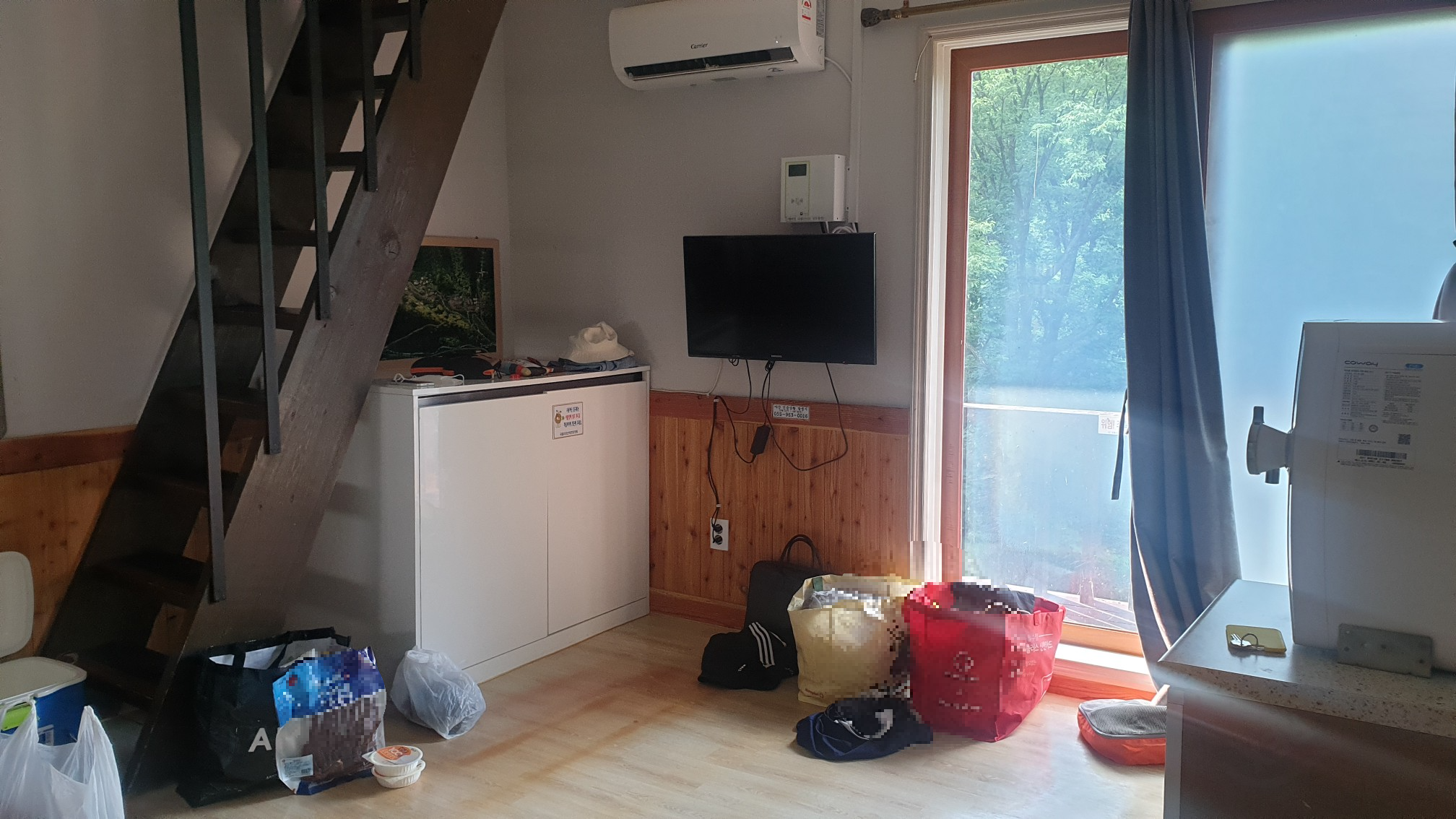 에어컨은 설치되어 있지만 유료구요, 아담한티비, 큰냉장고와 압력밥솥과 왠만한 주방기구는 다 갖춰져 있답니다.