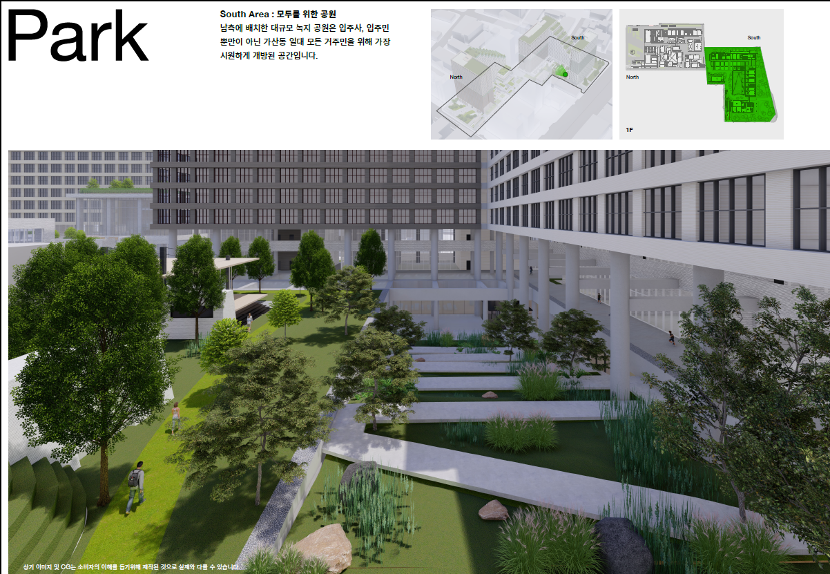 뻔해보이는 이야기 같지만 그동안의 가산디지털단지 지식산업센터분양 현장에서는 찾아볼 수없었던 스토리와 계획을 가진 아파트형공장 분양 현장으로 보이더군오. 퍼블릭이라 명명한것 또한 특정지역장소가 아닌 지역전체를 아우르는 꼭필요한 컨텐츠와 환경제공과 함께 기존의 업무환경과 자연스럽게 연결되는 로컬코뮤니티 전반의 삶의질 향상을 지향한는것이 퍼블릭이라느 설명입니다. 또한 그린캠퍼스를 표방한 현대가산퍼블릭은 모두를 위한 그린 캠퍼스를 내세우고 있죠.