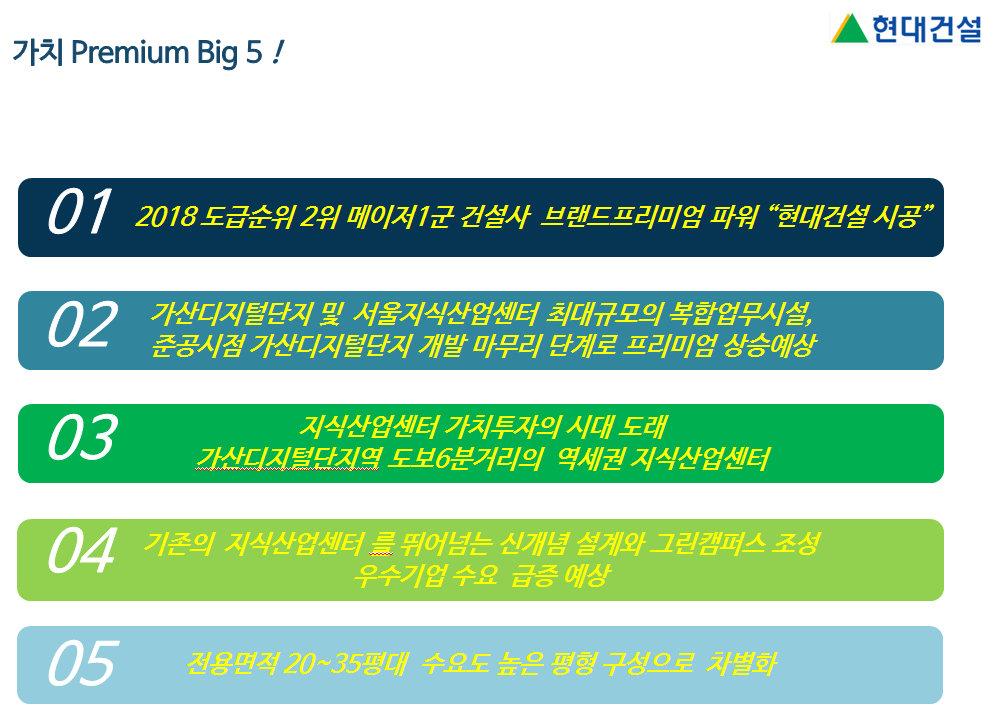 시행사 웰스어드바이저스와 시공사 현대건설이 건설하는 현대지식산업센터 가산퍼블릭은 천편일률적인 그동안의 가산동지식산업센터를 탈피한느 녹지에 문화를 합한 특별한 공간제공과 환경을 통해 기존의 지식산업센터만을 생각했다면 입이 떡벌어질만한 고급형 지식산업센터분양 공급을 추구하고 있습니다.