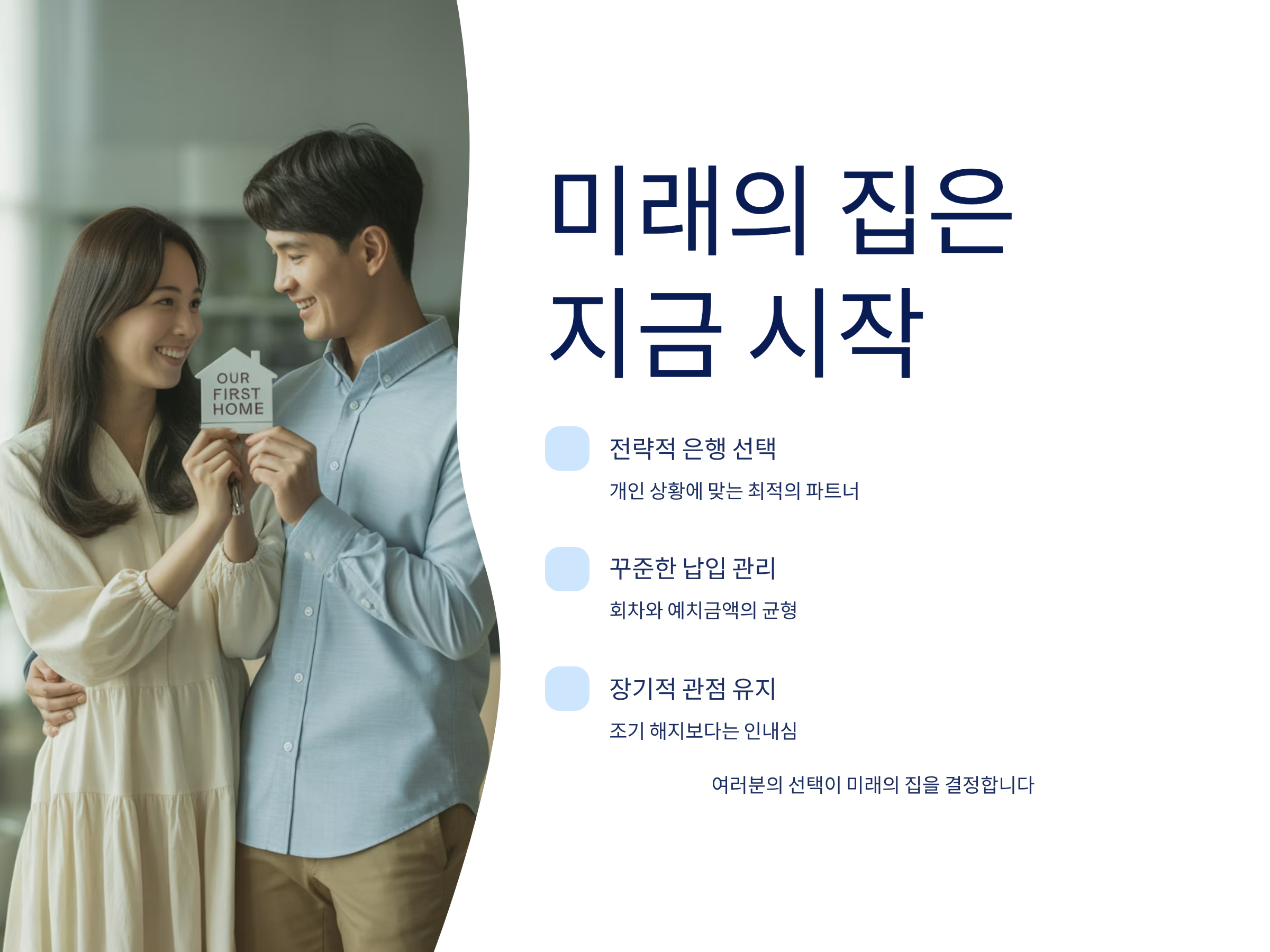 가입, 전환, 해지 방법을 올바르게 이해하고 전략적으로 관리한다면 단순 저축 이상의 효과를 누릴 수 있습니다. 이제 여러분의 선택이 미래의 집을 결정할 차례입니다.