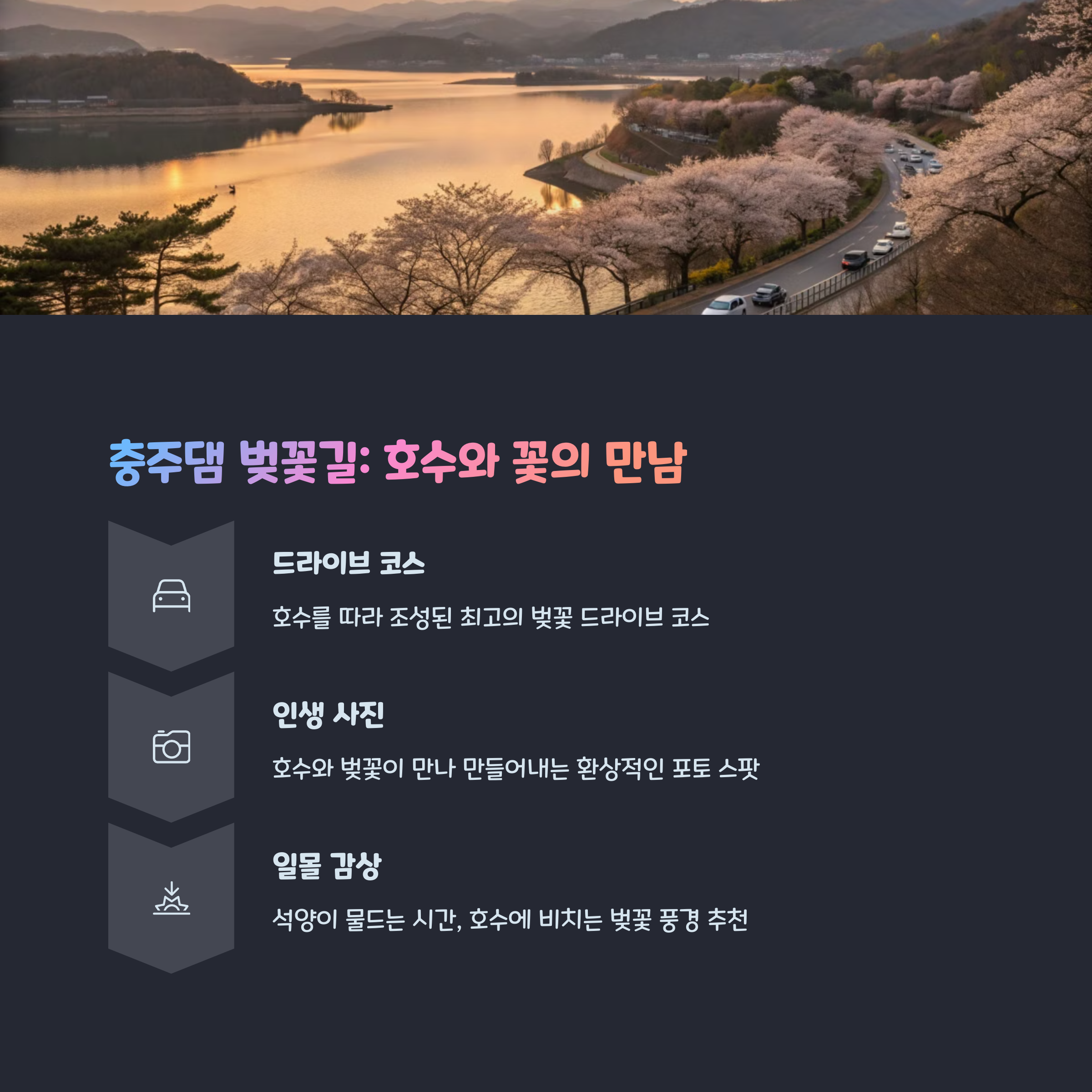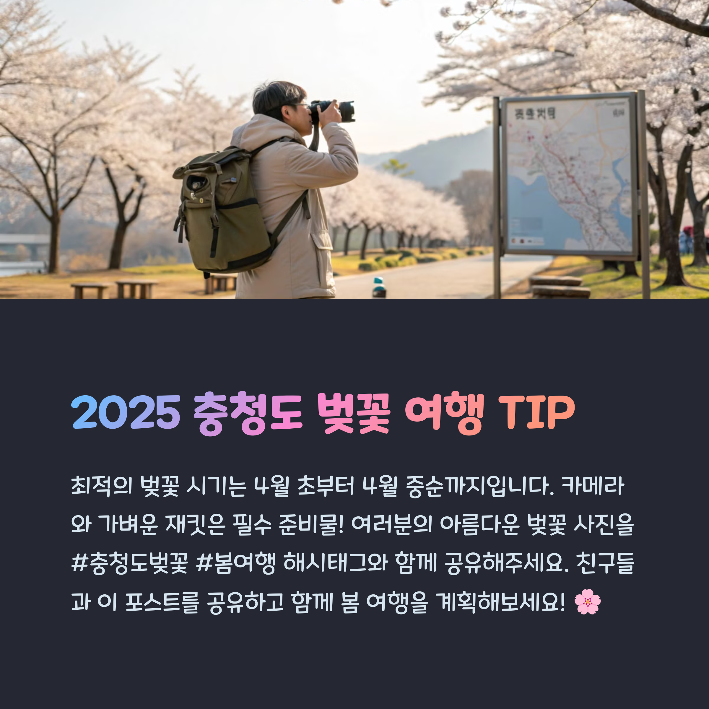 충청도의 벚꽃 명소는 각기 다른 풍경과 테마로 구성되어 있어, 연인, 친구, 가족 모두가 만족할 수 있는 봄 여행지를 제공합니다. 사찰의 고즈넉함, 성당의 이국적인 분위기, 호숫가의 낭만, 산책길의 여유까지 다양하게 즐길 수 있죠. 무엇보다도 관광과 힐링을 동시에 누릴 수 있는 점이 큰 장점입니다.
