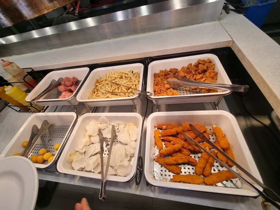 샐러드바 초밥 코너는 연어초밥, 참치초밥, 불초밥, 소고기초밥 등으로 구성되어 있었습니다. 신선도는 무난한 수준으로 느껴졌습니다. 튀김류는 새우튀김, 고로케, 오징어튀김 등이 바삭하게 제공되었습니다.