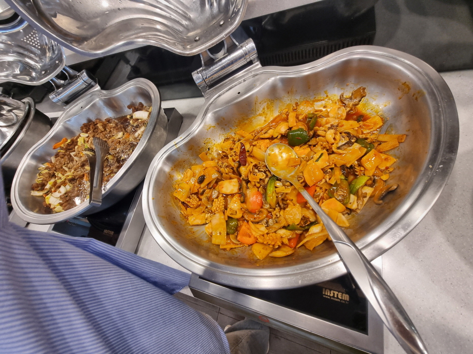 샐러드 코너에서는 리코타치즈 샐러드가 가장 인기가 많았습니다. 즉석에서 제공되는 우동, 쫄면, 스파게티류도 별도로 마련되어 있습니다.