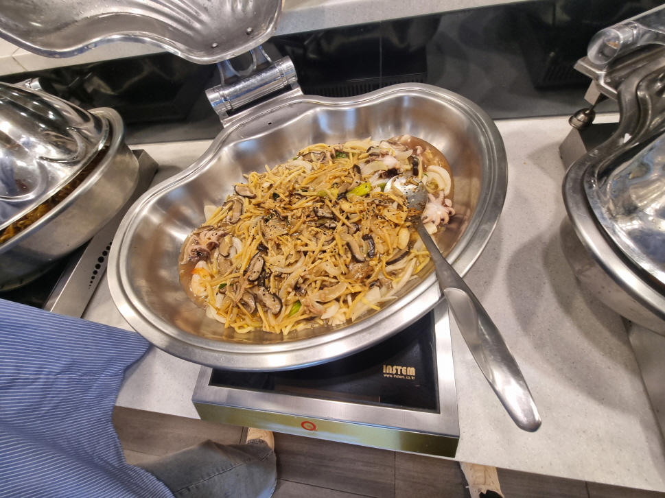 샐러드 코너에서는 리코타치즈 샐러드가 가장 인기가 많았습니다. 즉석에서 제공되는 우동, 쫄면, 스파게티류도 별도로 마련되어 있습니다.