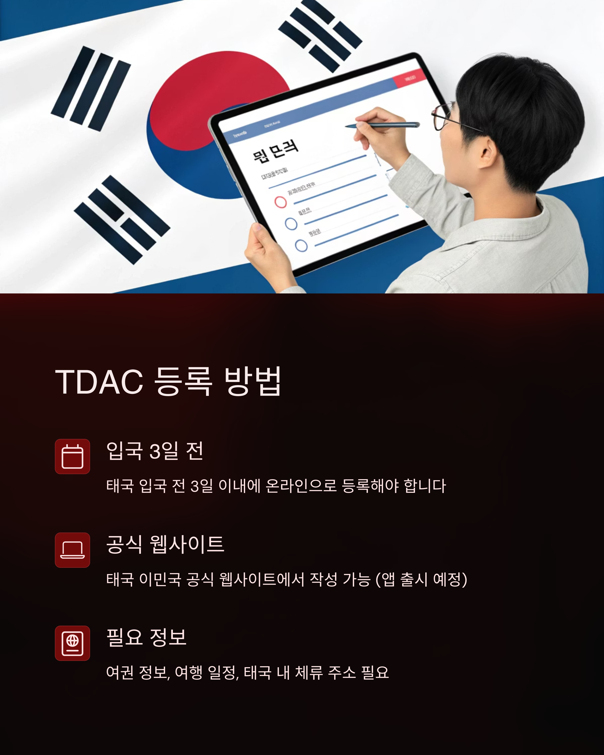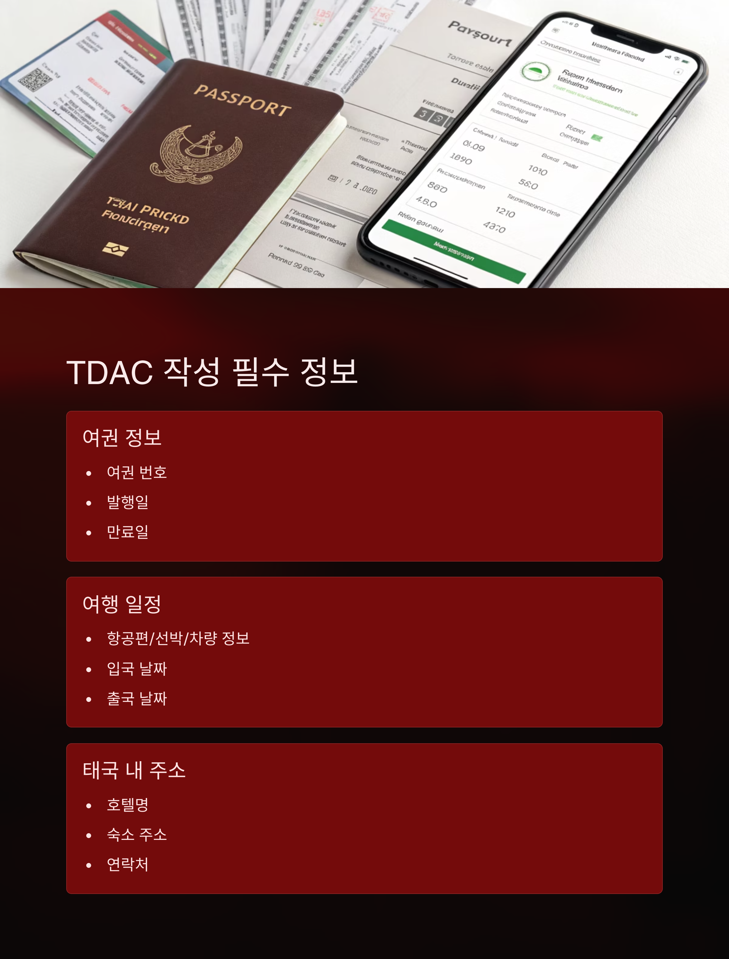| TDAC란? | 태국 입국 전 필수로 작성해야 하는 디지털 입국 카드입니다. |