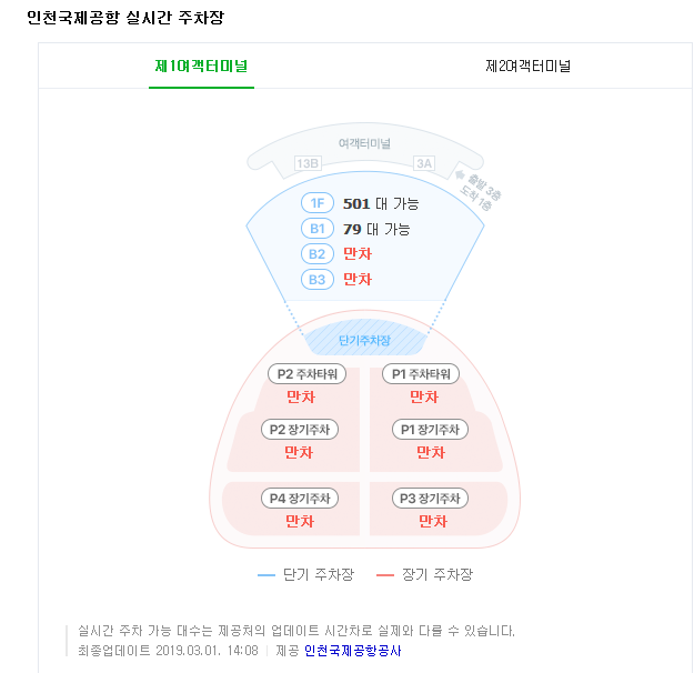 인천공항 출발시에도 먼저 녹색창포털에서 인천공항 주차장을 조회하면 이처럼 뜹니다. 가까이 갈즈음 다시 조회에서 이동하시면 되구요. 아무래도 밤비행기를 이용하시려면 주차하긴 쉽지 않을것 같은데요, 저는 그래서 주로 새벽비행기를