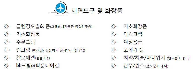 세면도구는 좋은호텔의 경우에는 잘갖춰있지만 저렴한 호텔의 경우에는 따로 준비하는게 좋아요. 좋은호텔이라도 아무래도 질이 우리나라 제품에 한참 못미치니 준비하면 좋구요 특히 샤워용볼이나 거품타올 준비하면 좋습니다.