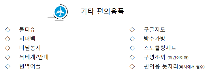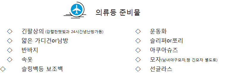 호텔에 따라 긴팔상의가 필요한분들도있을수 있으니 하나쯤 준비하시구요. 썬크림은 우리나라에서 가져가는것 보다 현지에서 쎈걸로 구입하시면 되겠네요. 스노클링세트도 아무래도 여러사람이이용한거라 찝찝하니 가족들이 사용한