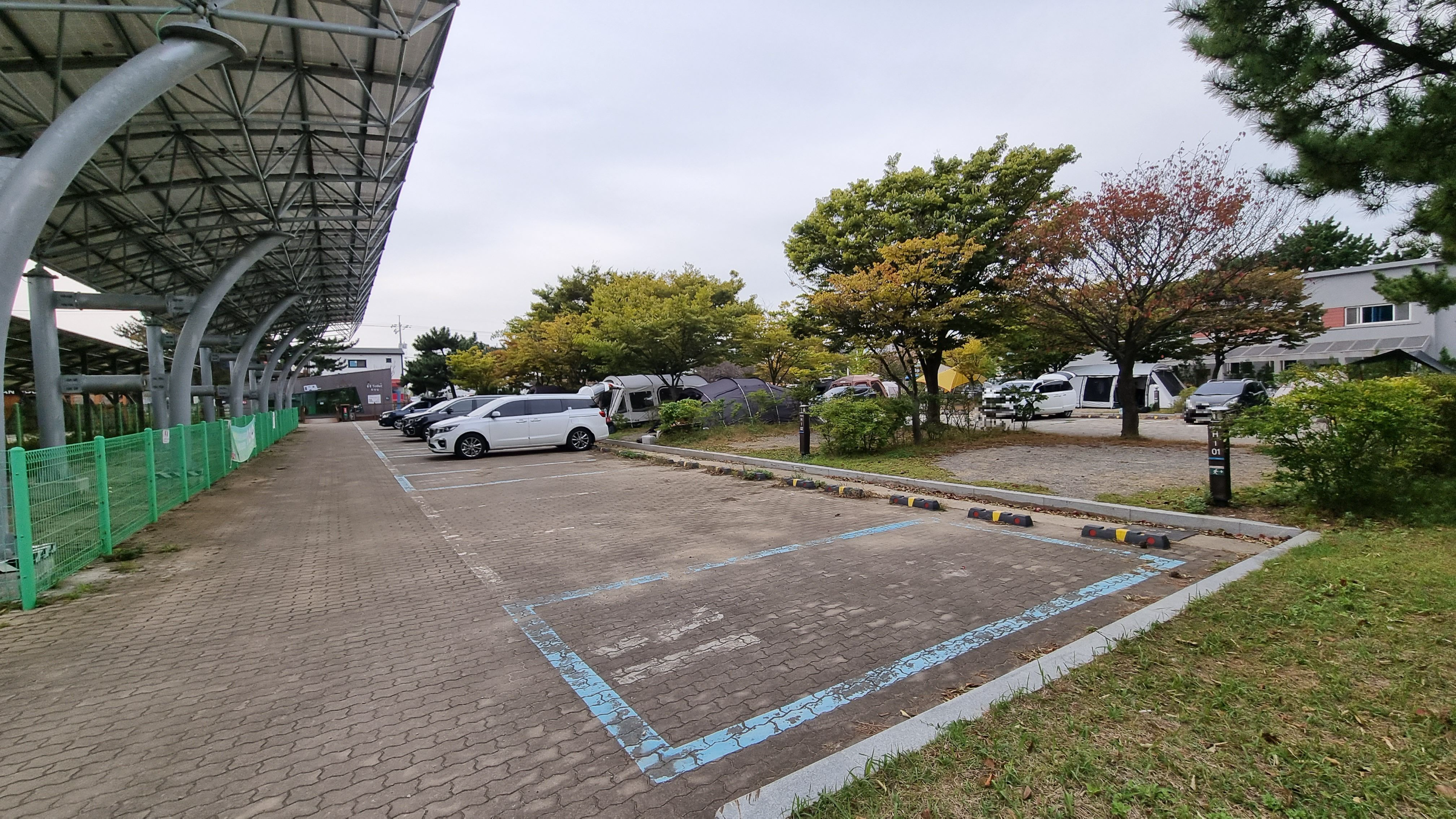 학암포오토캠핑장 h영지주차장 모습이비낟. 각 영지 마다 2~3대를 주차를 할 수있기 때문에 어린자녀를 둔 2가족이 사용해도 전혀 문제가 되지 않아요. 물론 지인끼리 온다면 저녁시간에 늦은시간 정숙은 꼭 유지해 주시기 바랍니다.