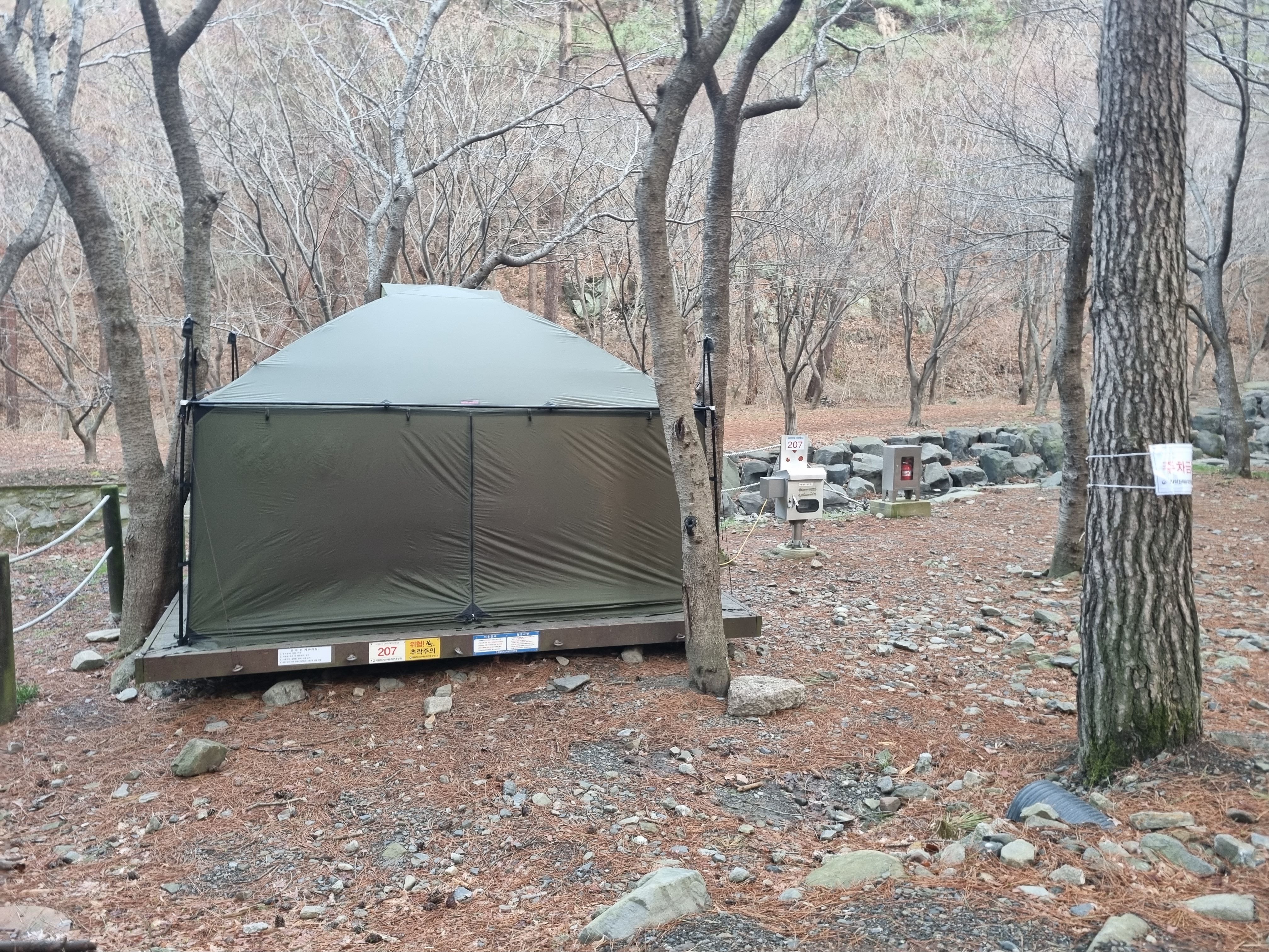 요즘 국립자연휴양림 야영장 데크에는 이브랜드 텐트나 쉘터를 많이 볼 수있는데요, 인기덕분인지 가격이 많이 올랐더라구요. 207데크도 계곡옆에 독립적이고 좋아요.