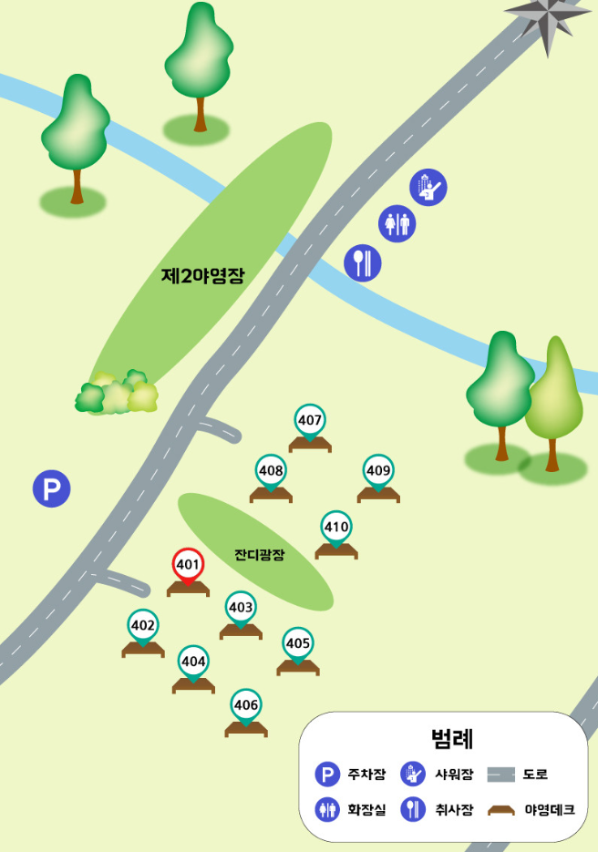 우측 안쪽의 406번 사이트도 끝쪽이라서 한적하고 누구에 방해없이 조용히 힐링 캠핑을 즐길수 있는 장소이죠.