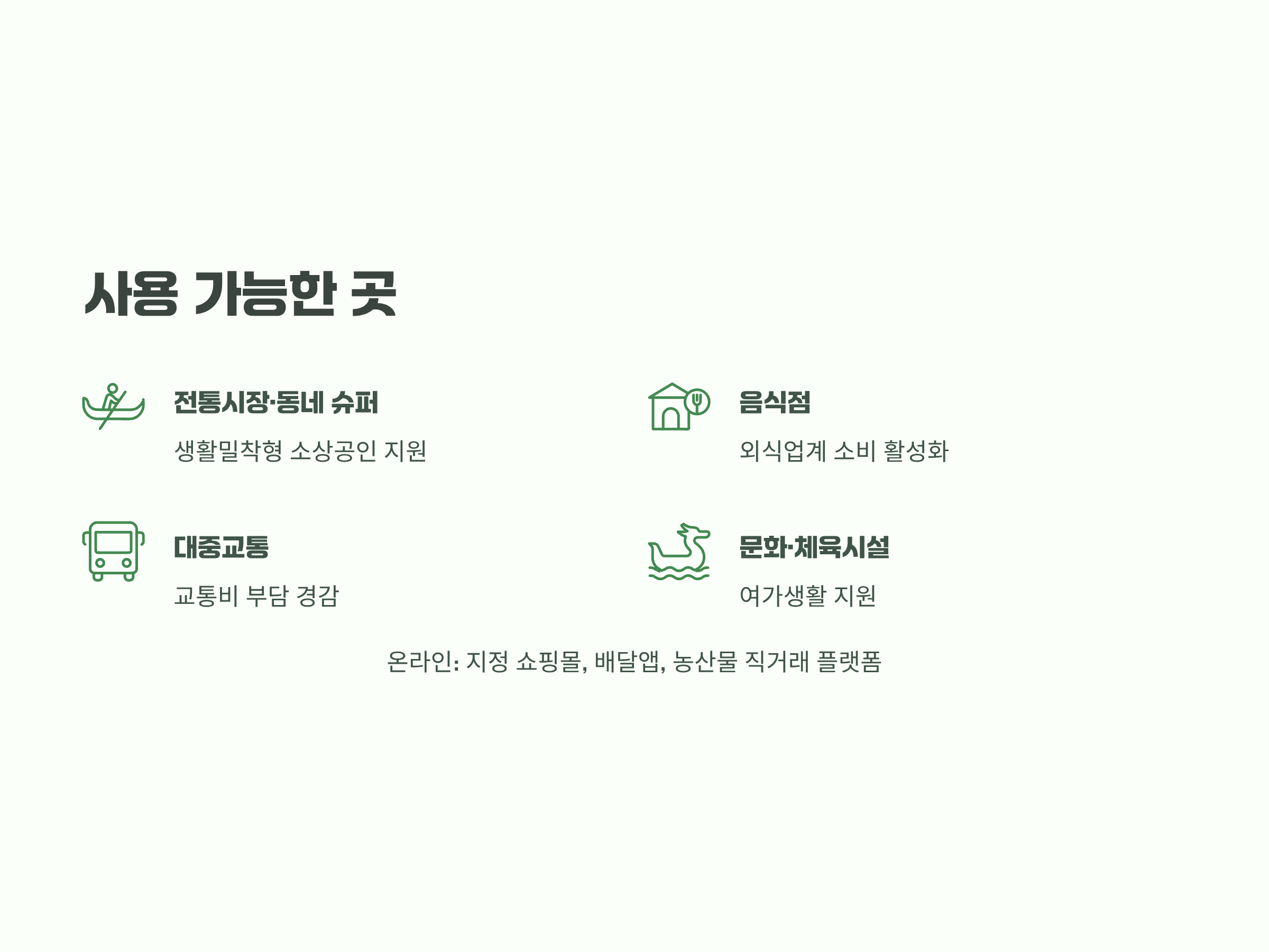 온라인도 지정 쇼핑몰, 배달앱, 농산물 직거래 플랫폼 등으로 확대되었습니다.